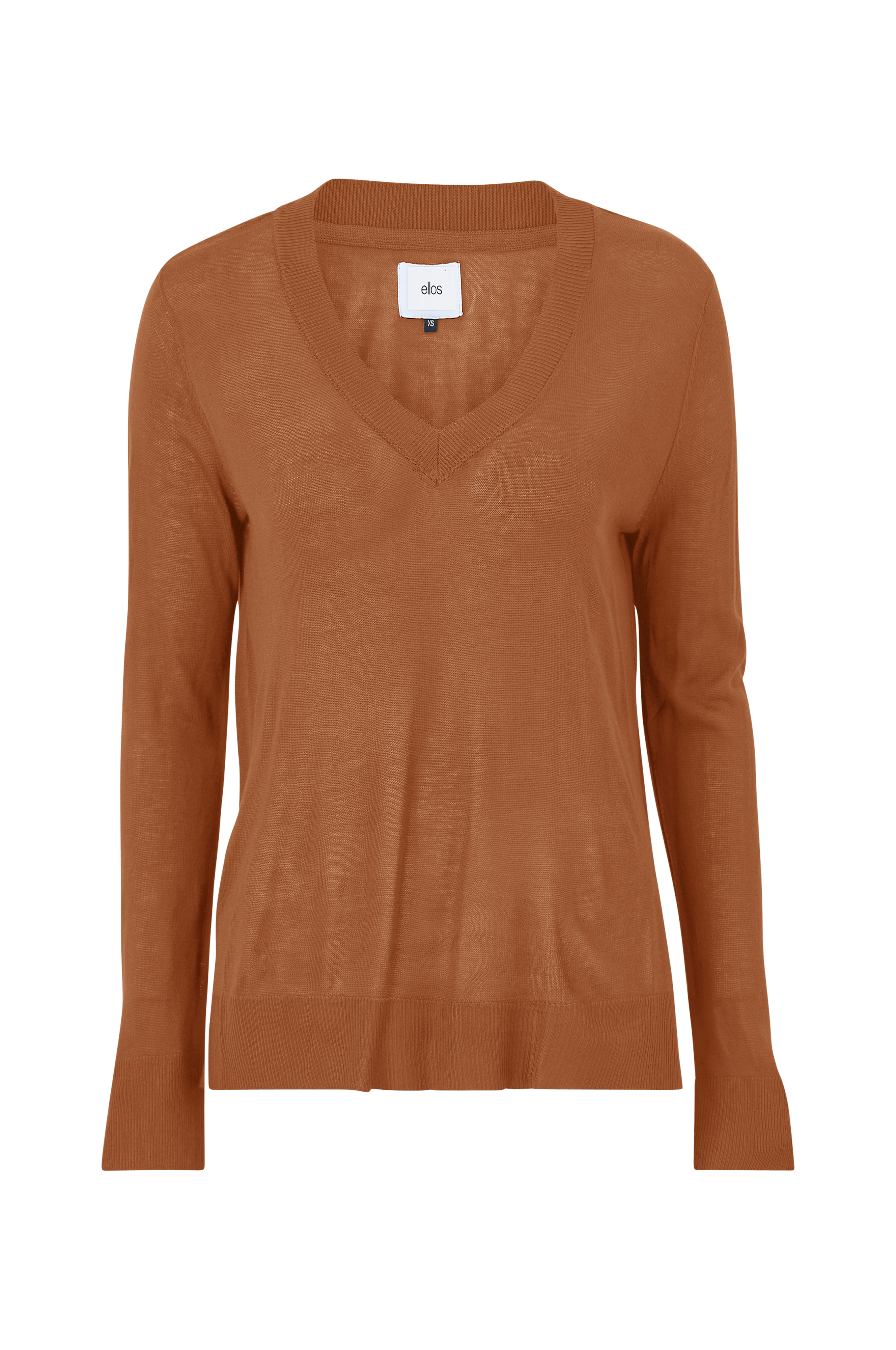 Finstrikket trøje Frida V i blød, tynd og semitransparent kvalitet. V-formet halsudskæring med ribkant. Rib i ærmekant og forneden. Noget længere bagpå.