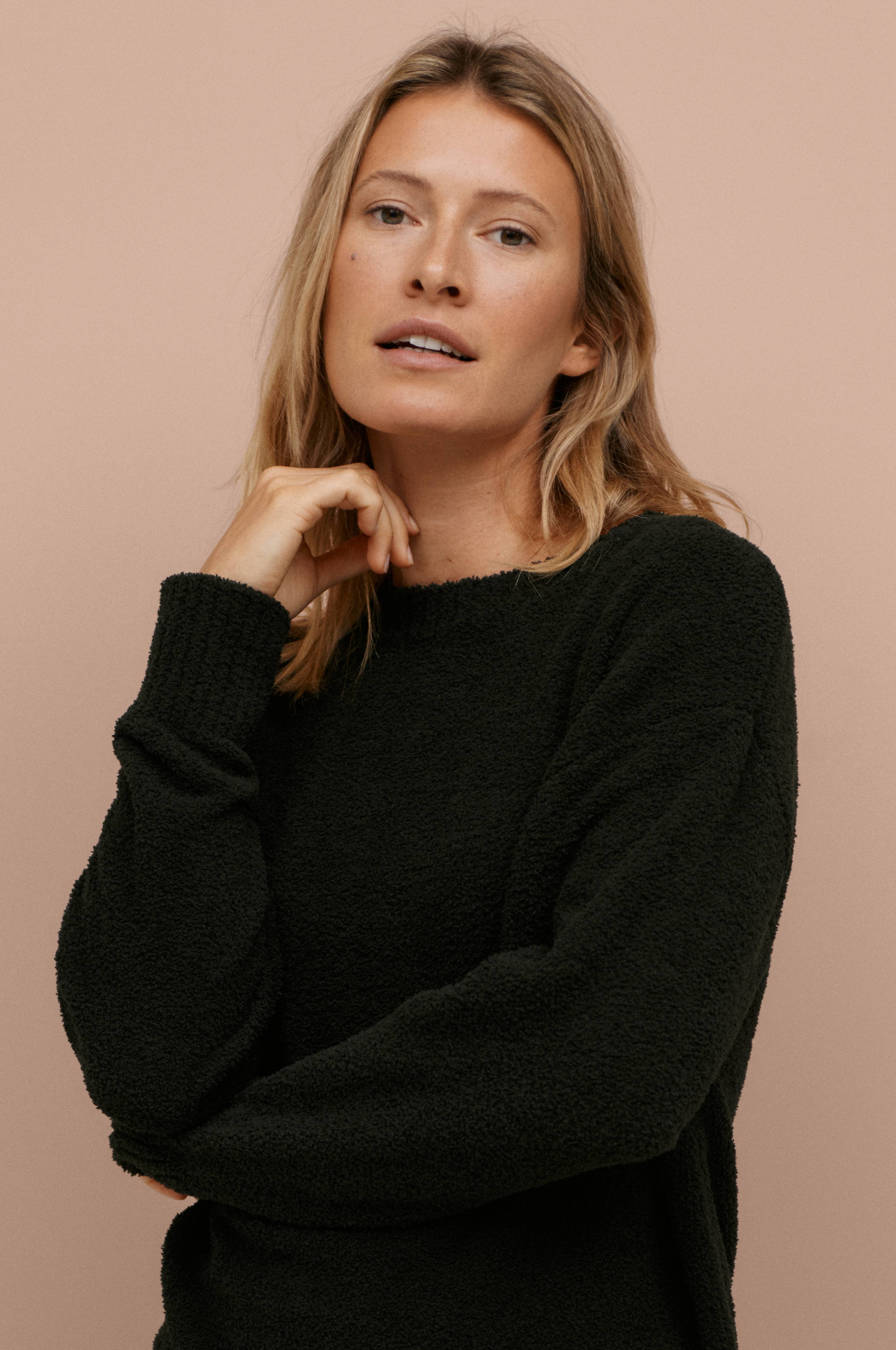 - Rund hals- Lav skulder- Ribkant i ærmekant og forneden- Af blød chenille- Produktet indeholder genindvundet materiale, som genbruges for at reducere mængden af affald samtidigt med at der ikke anvendes nye ressourcer.
