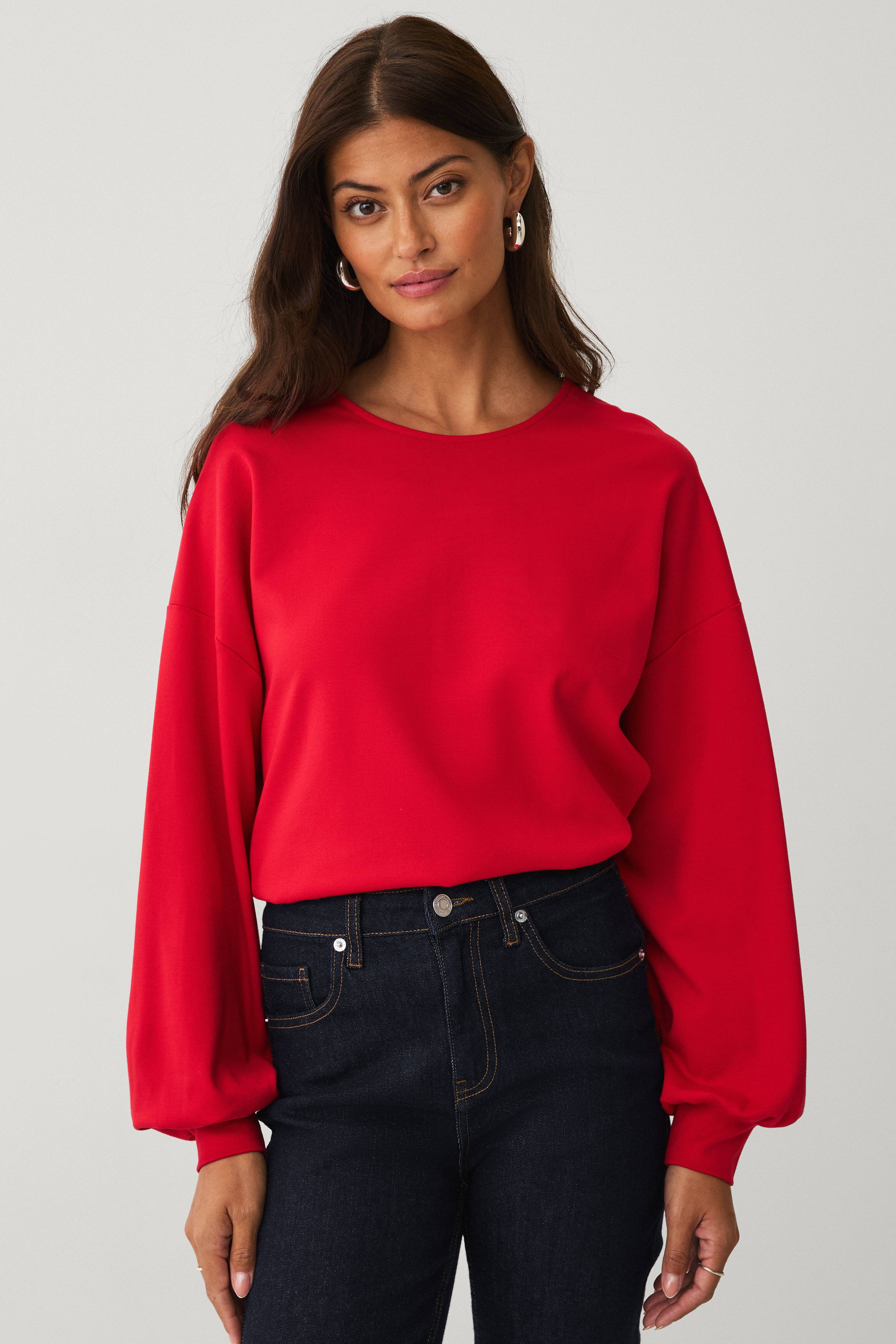 • Elastisk trøje med nedsænkede skuldre og lange ærmer• Rund halsudskæring med nøglehulsåbning og knap i nakken• Manchetter med samling ved ærmeafslutningerne• Længde: 58 cm i størrelse S