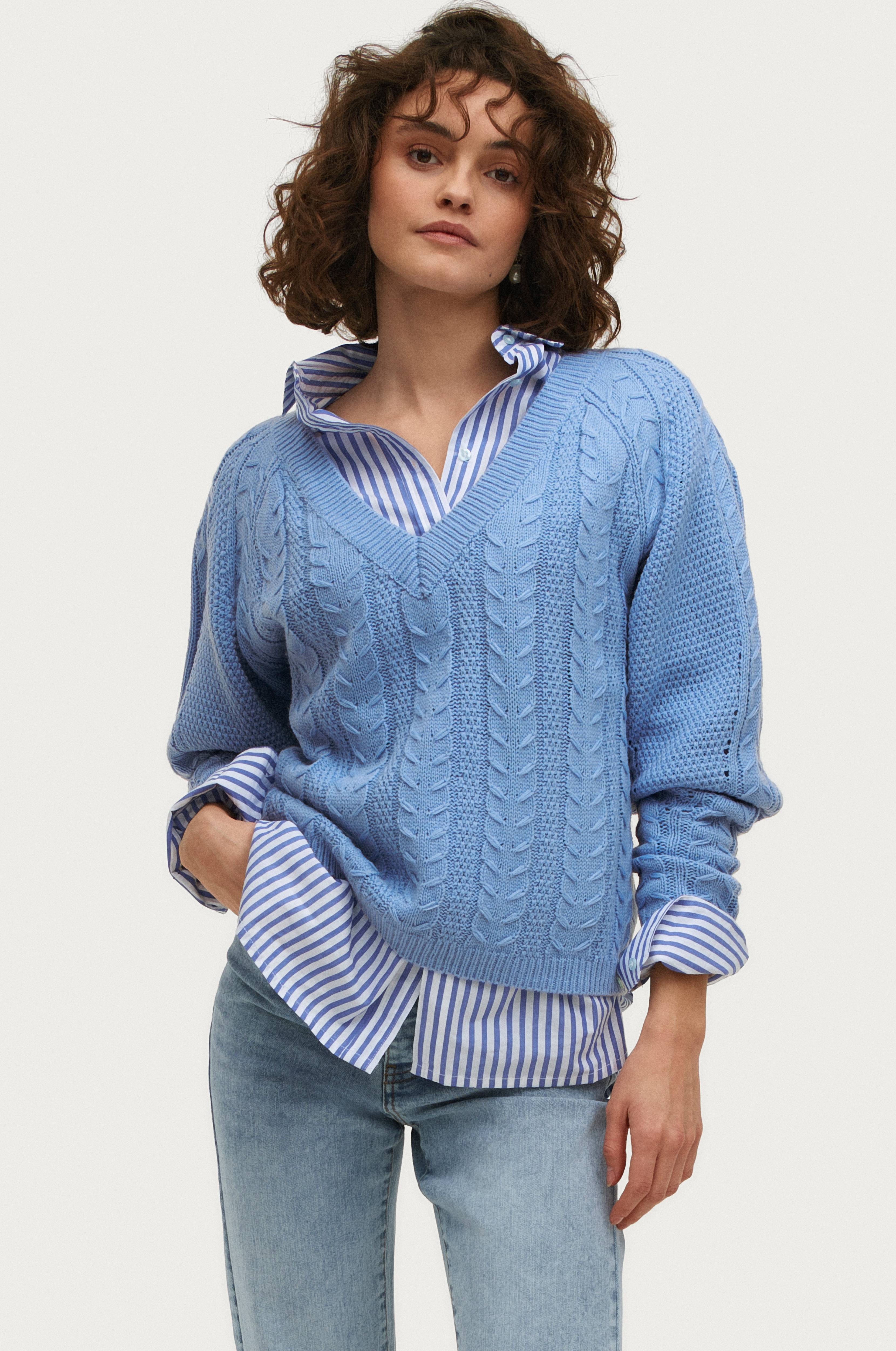 • Lige oversize model med kabelstrikket mønster• V-formet, ribstrikket halsudskæring• Manchet i rib ved manchetterne og nederst• Længde: 60 cm i størrelse 34/36