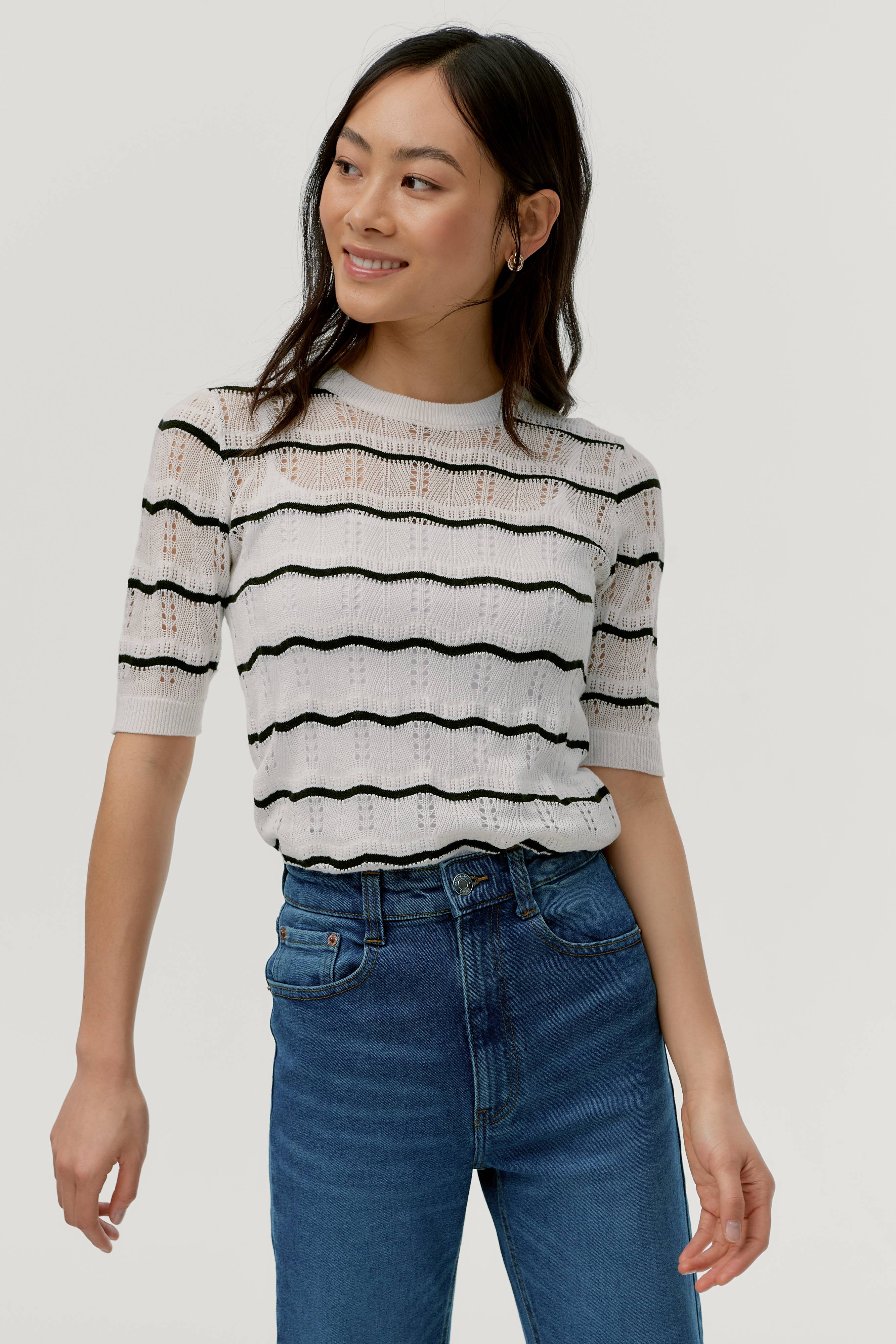 Tynd, løststrikket trøje med hulmønster. Fin model med halvlange ærmer. Ribstrikket kant forneden, i ærmekant og hals. Længde ca. 57 cm i str. 34/36.