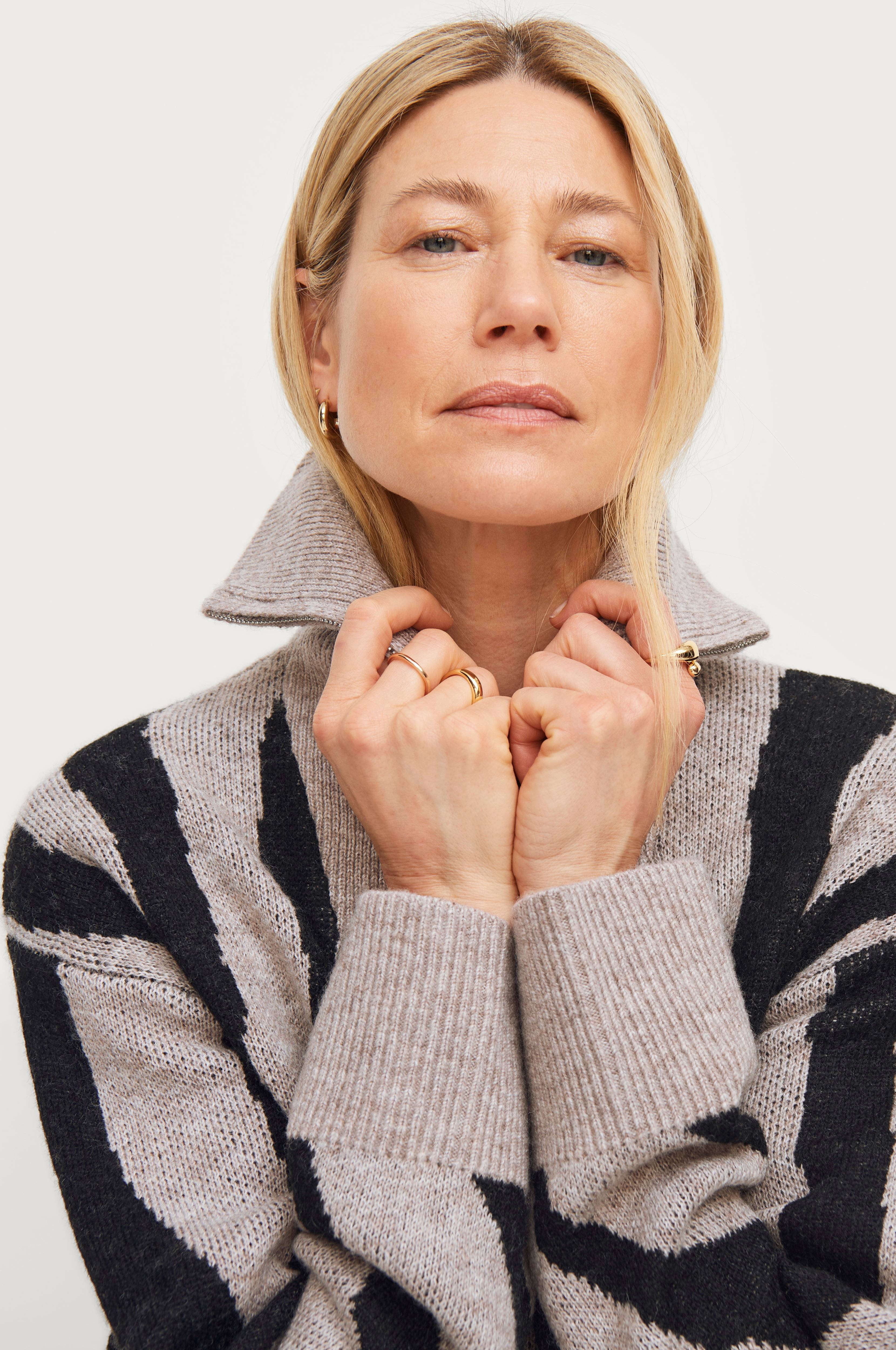 • Strikket trøje i uldblanding • Ribbet sjalskrage • Halvlang lynlås • Brede ribkanter ved ærmeafslutningerne og nederst • Længde: 64 cm i størrelse 34/36
