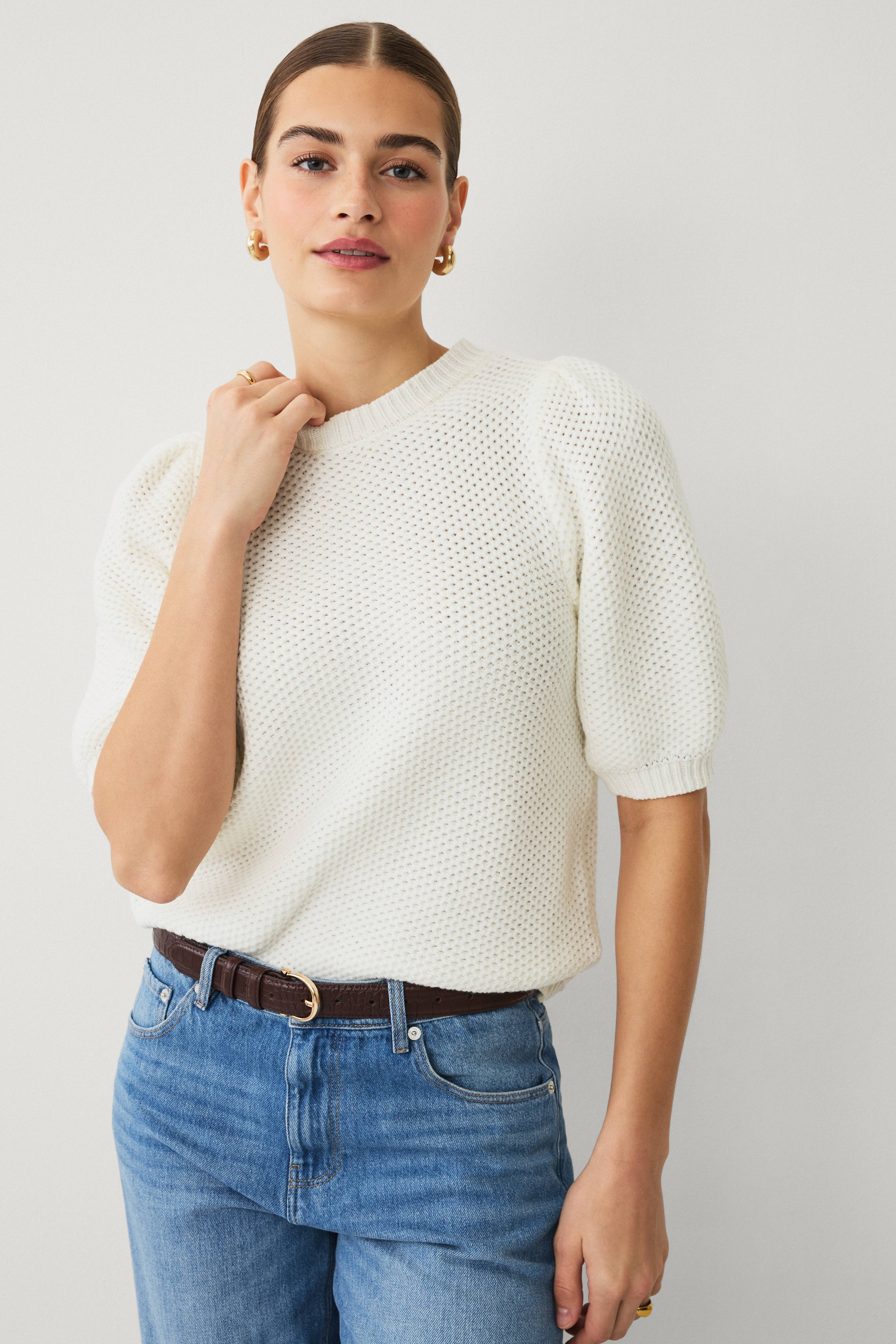 • Strukturstrikket, blød trøje med korte pufærmer• Afrundet, ribstrikket halsudskæring• Ribstrik ved manchetterne og nederst• Længde: 52 cm i størrelse S