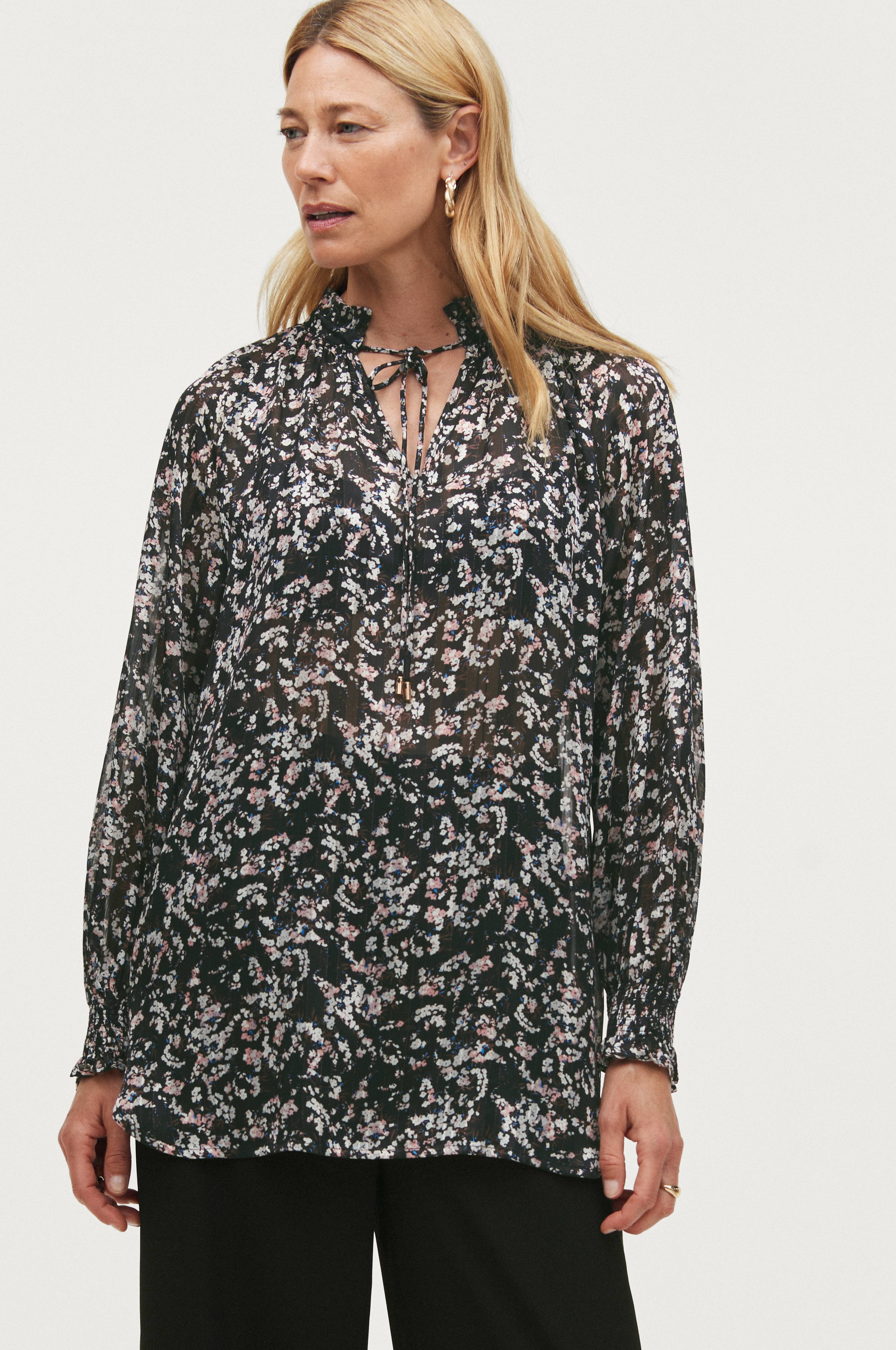 Tunika i lige model med løst snit af chiffon med diskret indvævet glittertråd. Påsyet flæse i nakken og slids med smalt bindebånd i halsen. Langt ærme med smockelastik i ærmekanten og afrundet slids forneden i siderne. Længde ca. 78 cm i str. 34/36.