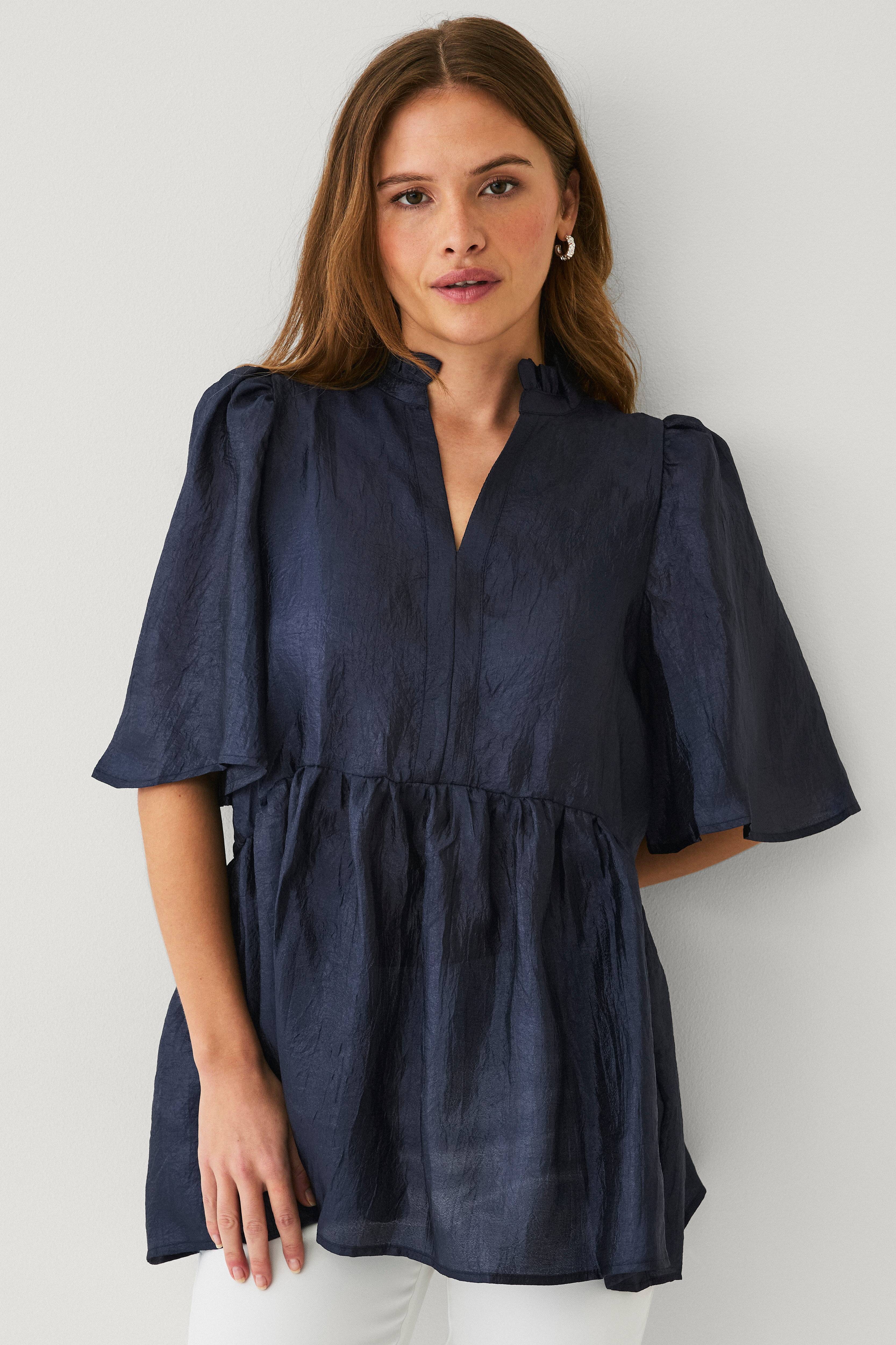 • Model med svaj• Volant i halsen• V-udskæring• Halvlange sommerfugleærmer• Samling på skuldrene og ved taljen• Behandlet kvalitet med glans• Længde: 75 cm i størrelse 34/36