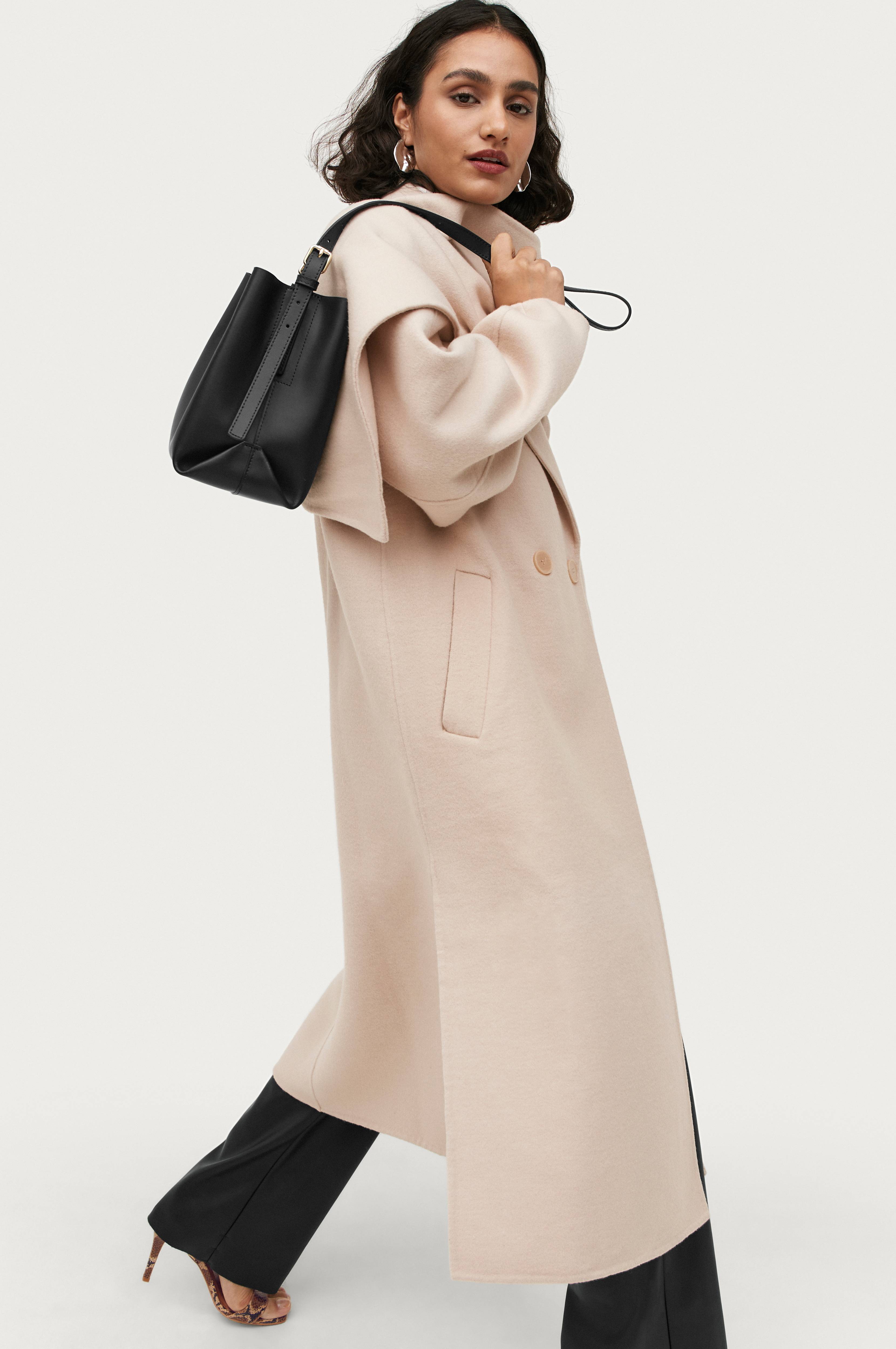 Frakke i lige, læglang model med vide ærmer og lave skuldre for en skøn oversizepasform. Dobbeltradet lukning og lommer foran. Høje slidser i siderne. I fin uldblanding. Matchende halstørklæde i samme farve og materiale medfølger. Frakken er tyndt foret. Længde ca. 114 cm i str. 34/36.