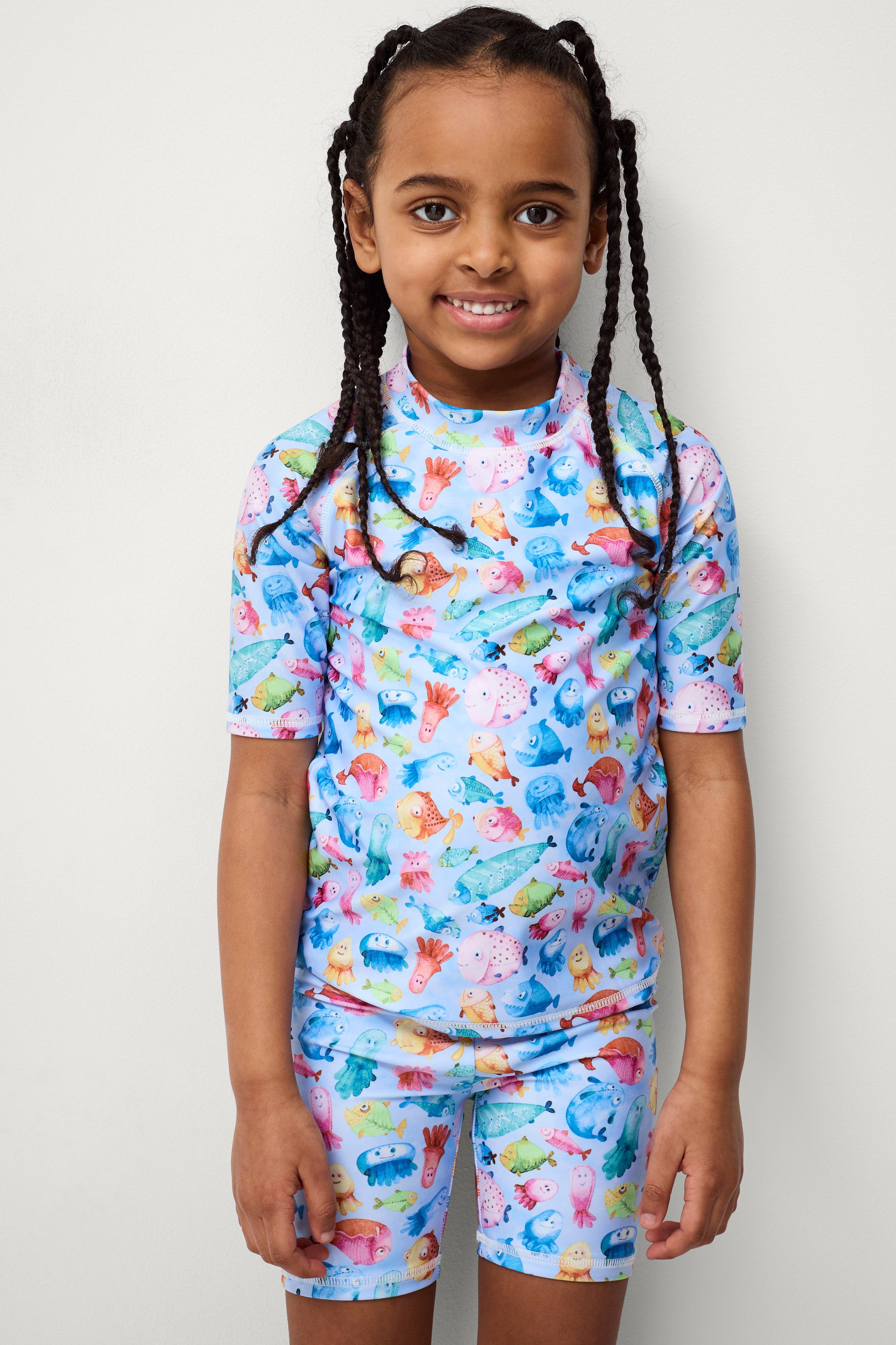 Solbeskyttelsessæt i to dele. Kortærmet top med rund hals og shorts med elastisk talje.