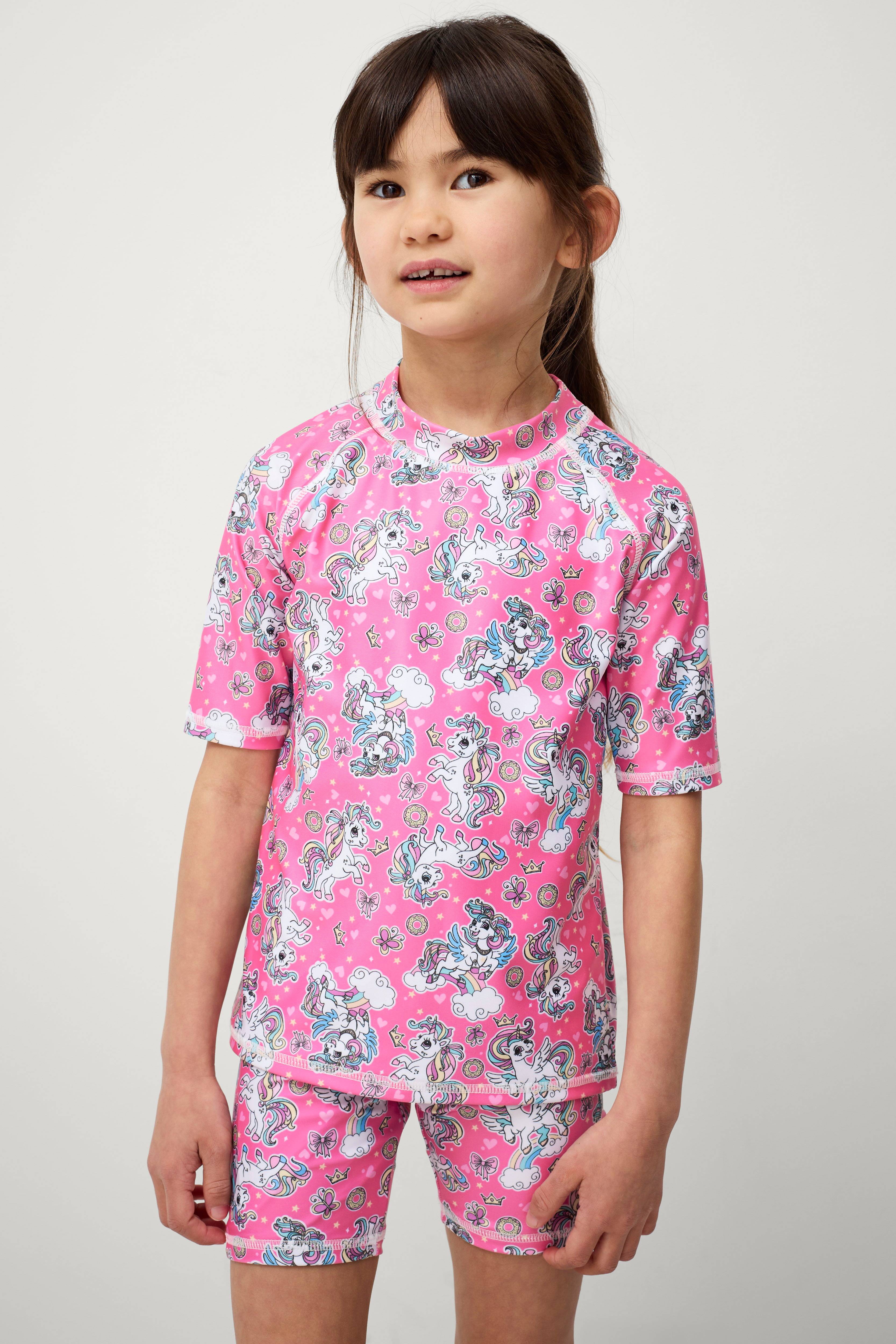 Solbeskyttelsessæt i to dele. Kortærmet top med rund hals og shorts med elastisk talje.
