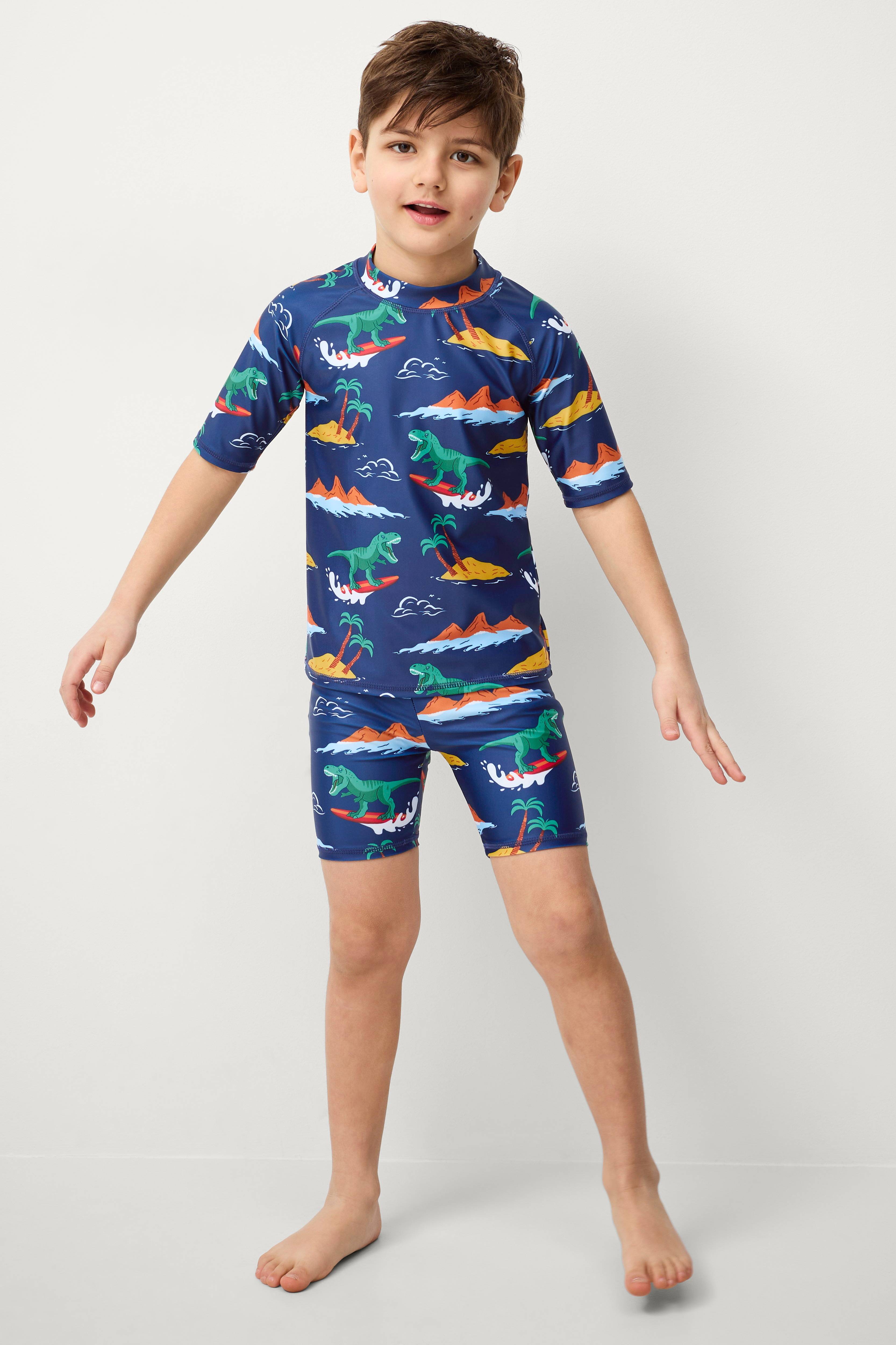 • 2-delt solbeskyttelsessæt• Elastisk jersey med printet mønster• Kortærmet t-shirt med rund, høj halsudskæring• Shorts med elastisk talje