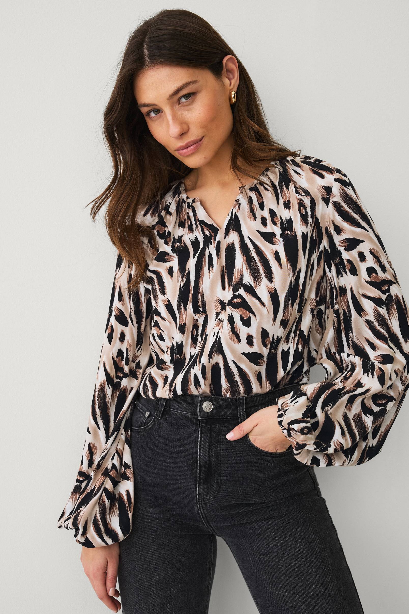 • Blød bluse i viskose• V-udskæring• Lange ballonærmer• Normal pasform• Længde: 62 cm i størrelse S