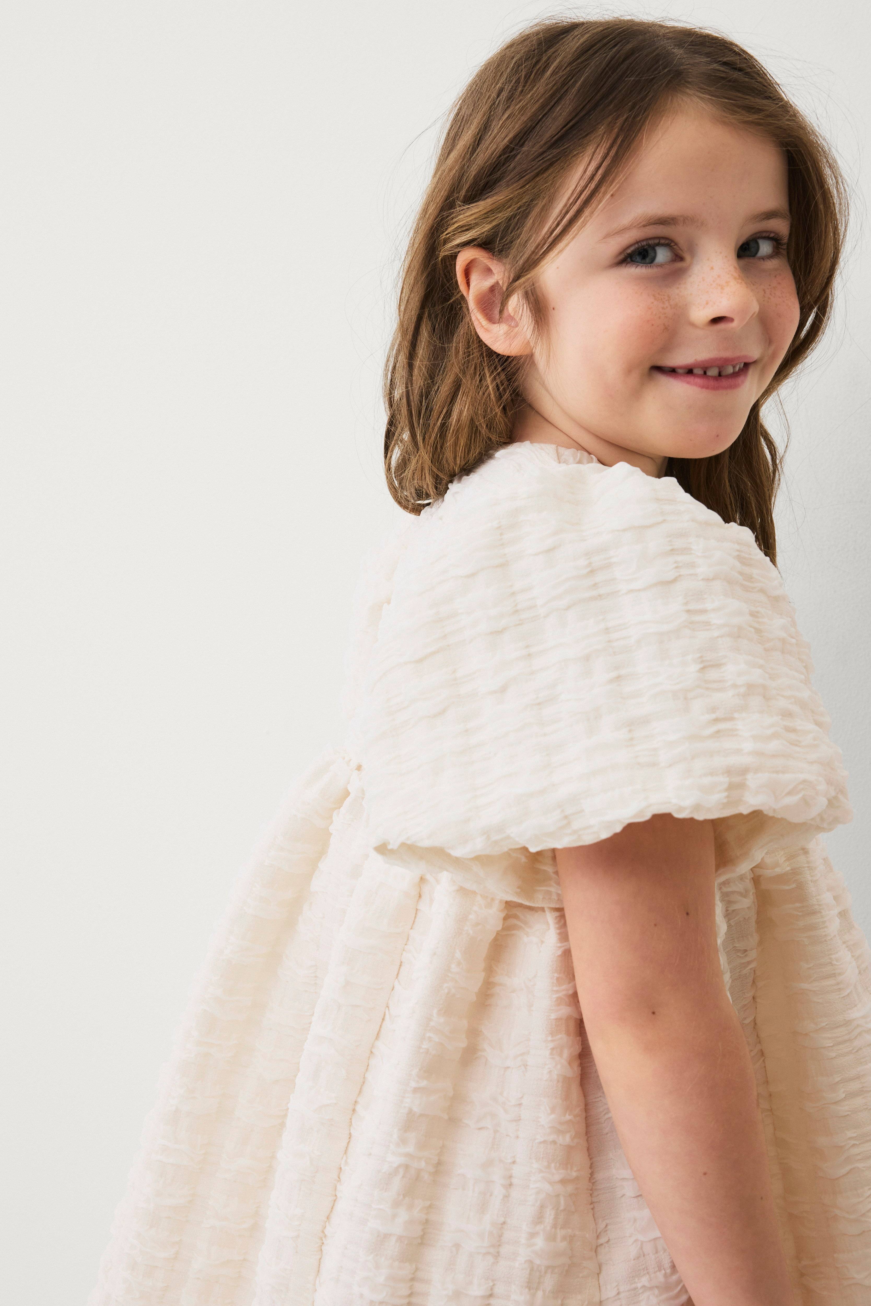 • Kjole i elastisk polyestermix med vævet, ternet strukturmønster• Korte ballonærmer• Blødt for på toppen og i ærmerne• Pasform med svaj nederst med fold• Åbning med knap i nakken