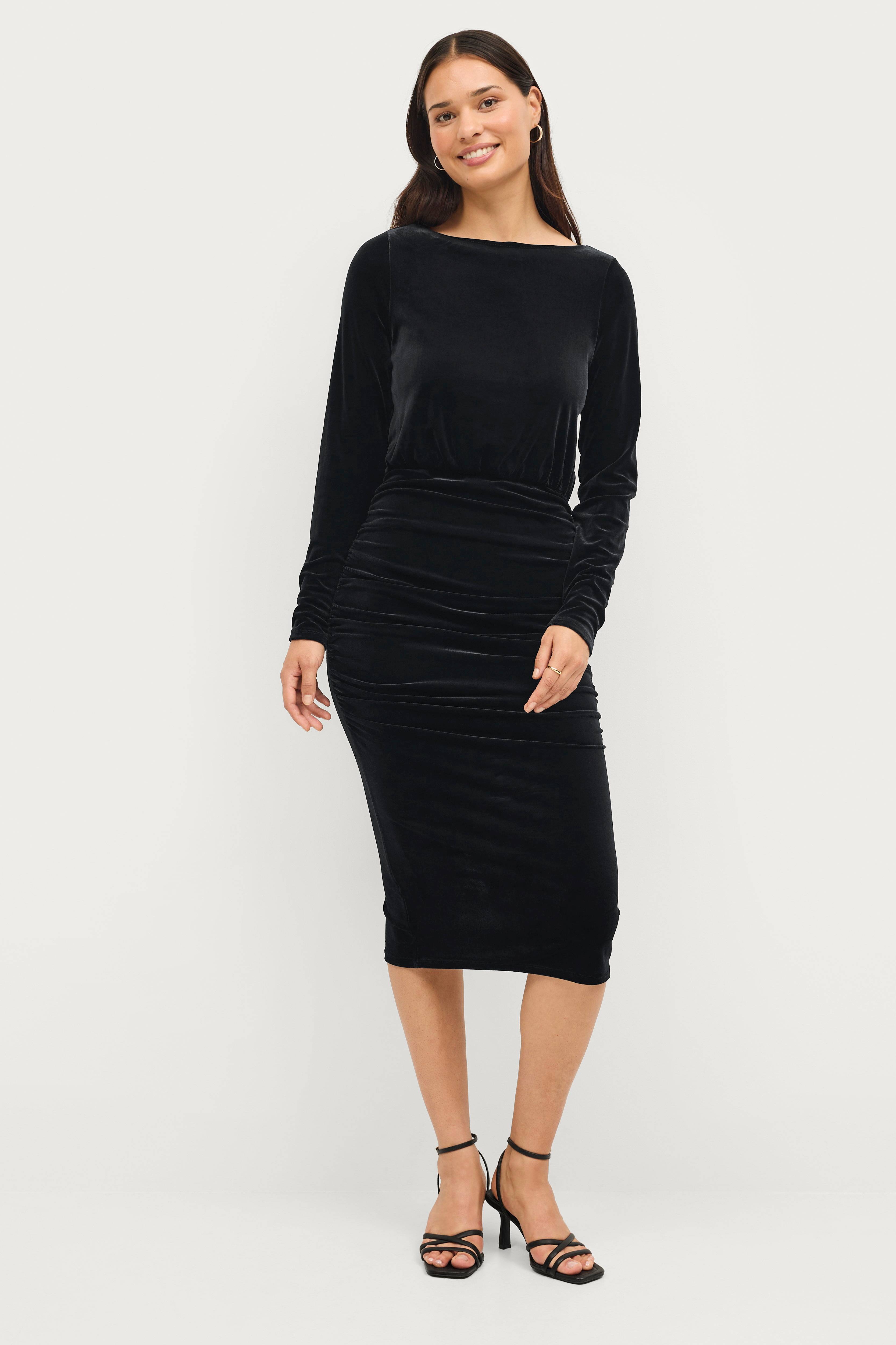 • Kjole i velour• Figursyet model• Blød, elastisk kvalitet• Rynket talje• Drapering i siderne• Lange ærmer• Længde: 116 cm i størrelse 34/36