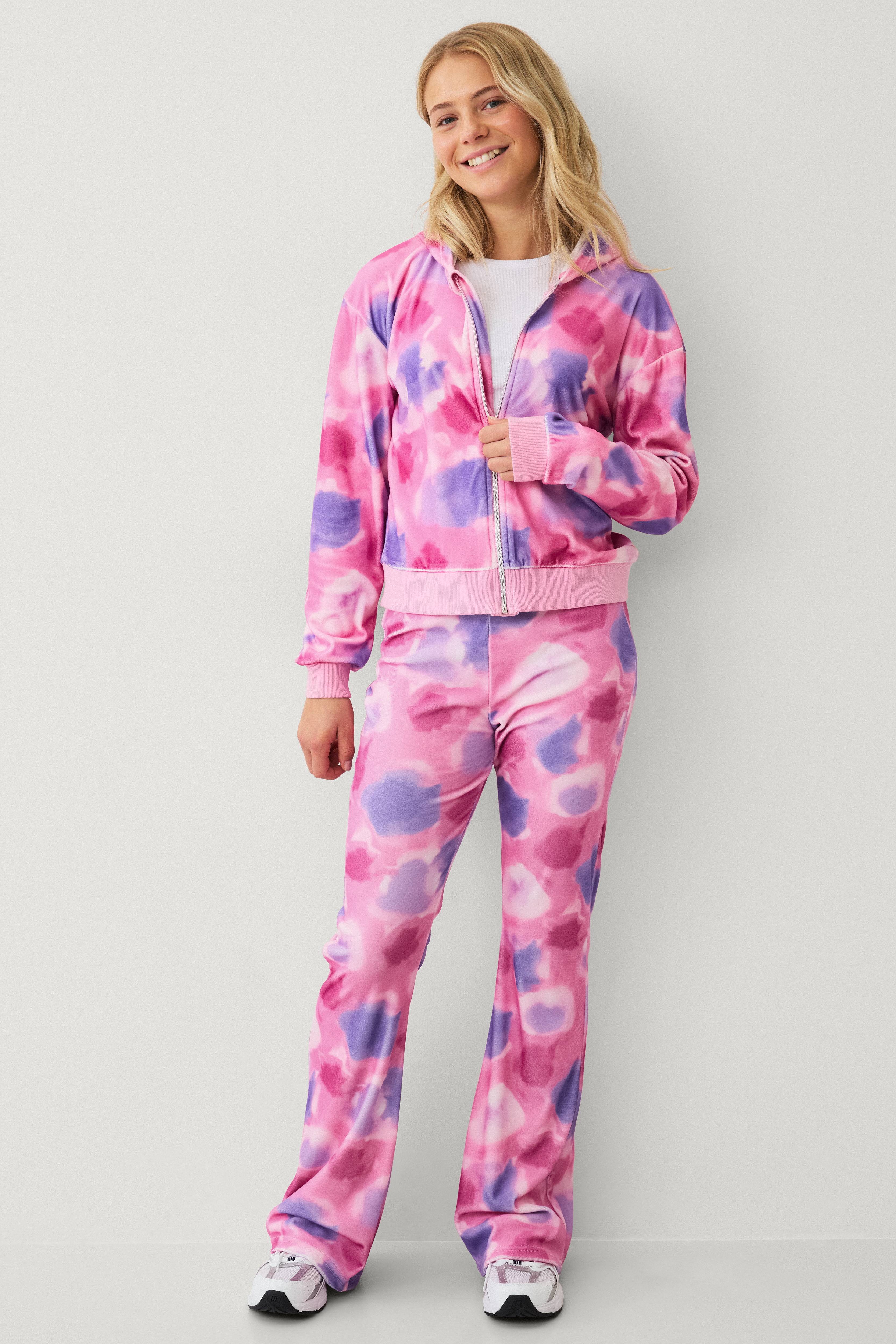 • 2-delt sæt i velour• Hættetrøje med lynlås• Ribmanchetter ved manchetterne og ved nederste kant• Bukser med træksnørre ved taljen og benafslutning med svaj