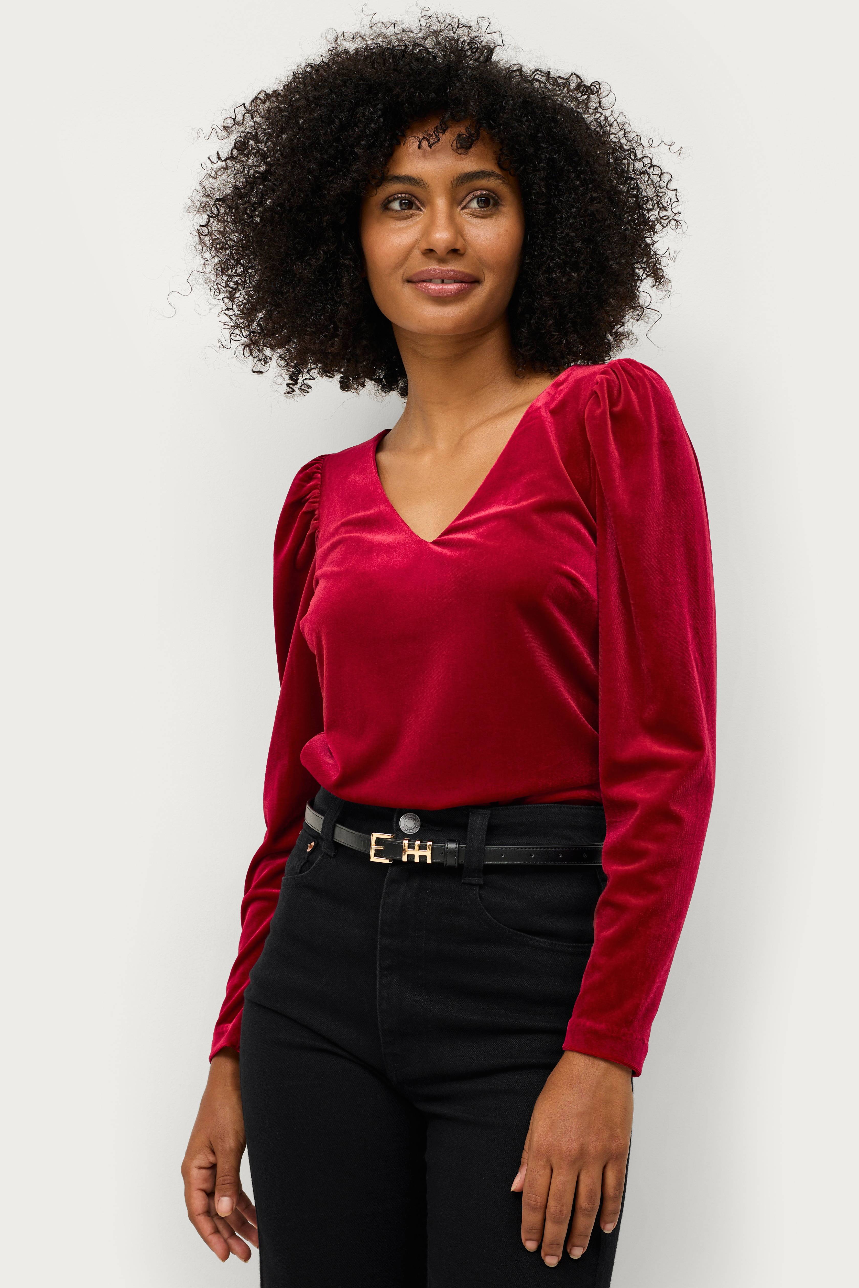 Dejlig julerød top. Lidt for længe - det vil være svært at stoppe indeni, fordi velouren er så tyk og toppen så lang. Men det virker på ydersiden af for eksempel en blyantskørt