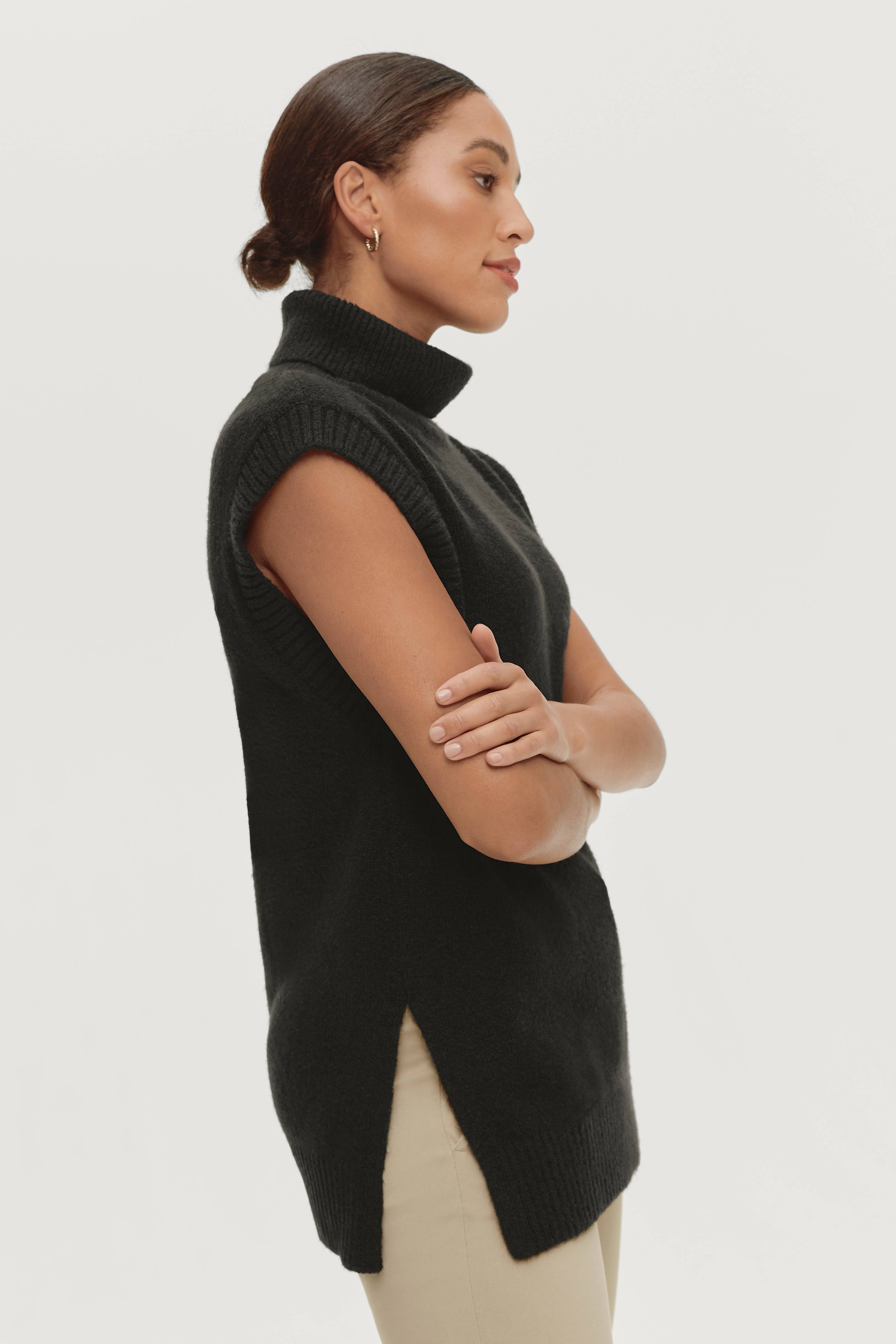 Vest Ina i oversizemodel med rullekrave, vide ærmegab og slidser i siderne. I blød, strikket kvalitet med ribstrikkede kanter. Længde ca. 73 cm i str. 34/36.
