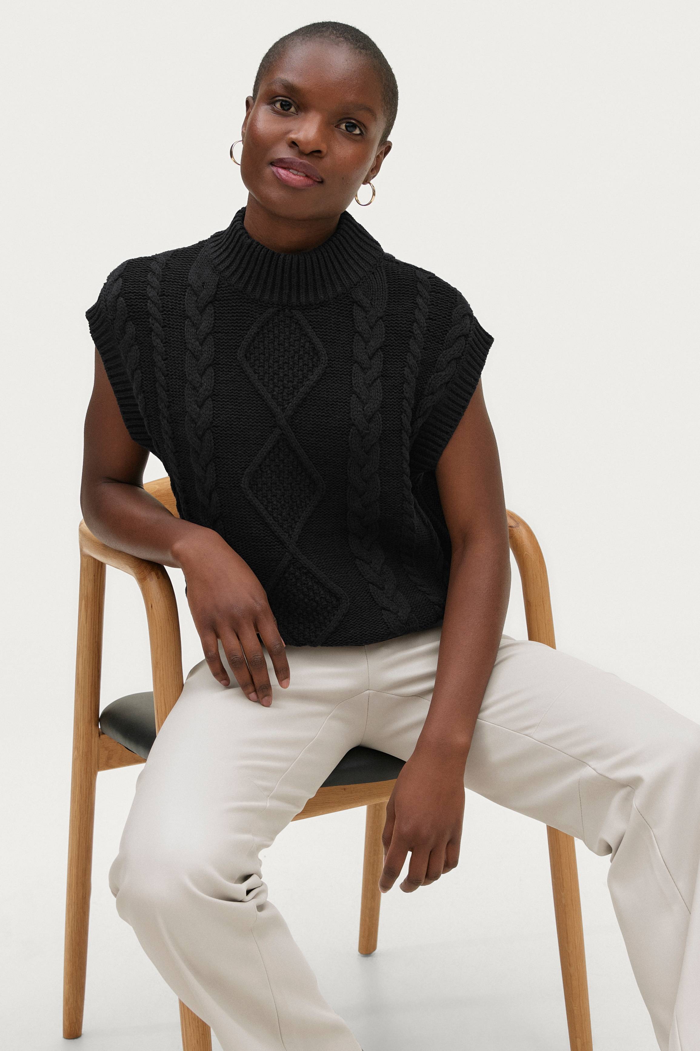 Vest Klara med strukturstrikket mønster både foran og bagpå. Ribstrikket kant forneden, i halsen og i ærmegabene. Længde ca. 56 cm i str. 34/36.