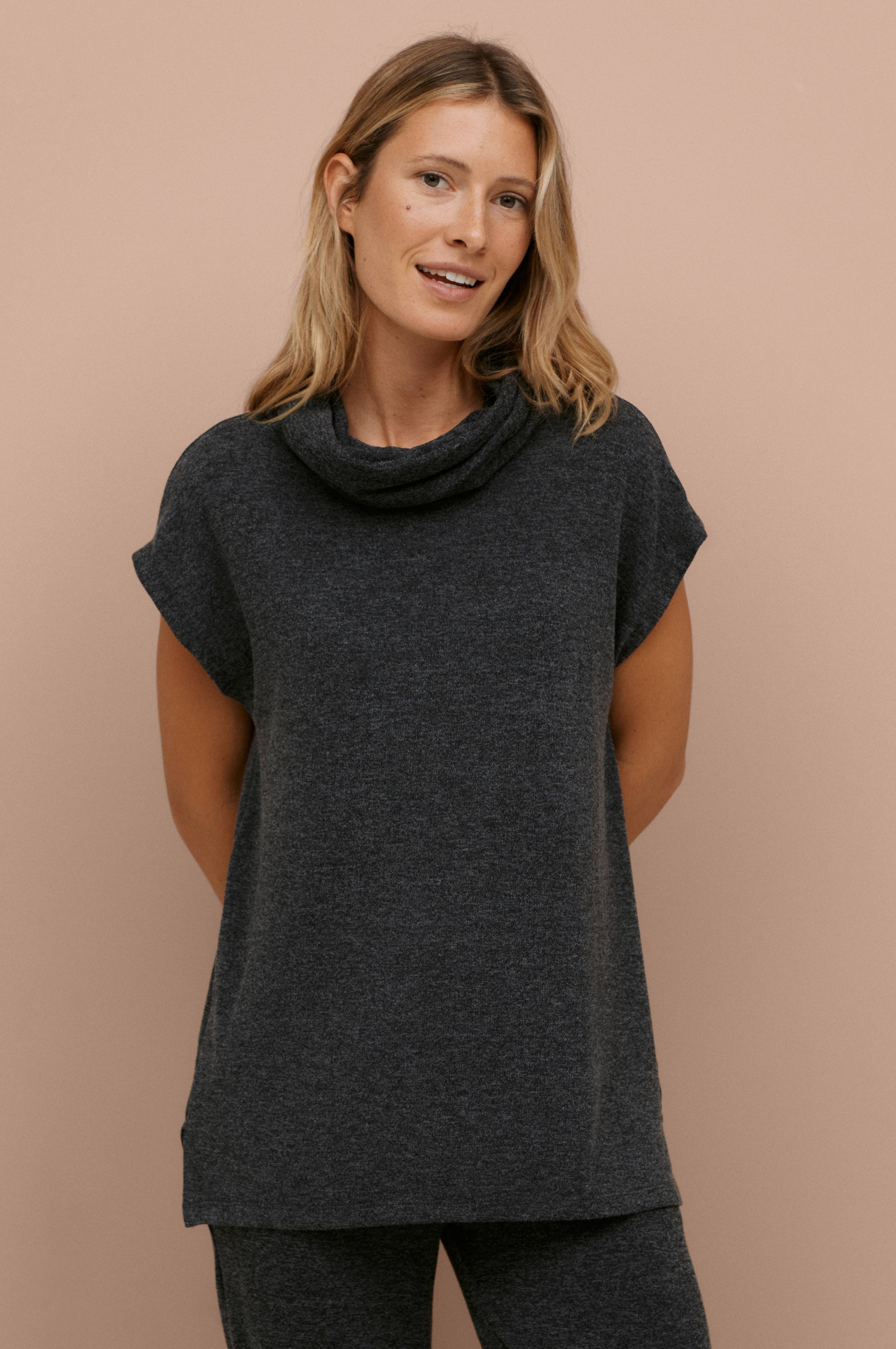 Skøn jerseytop i blød, noget tykkere jersey med meleret effekt. Stor, hyggelig rullekrave. Slids i siderne forneden. Længde ca. 70 cm i str. 34/36.
