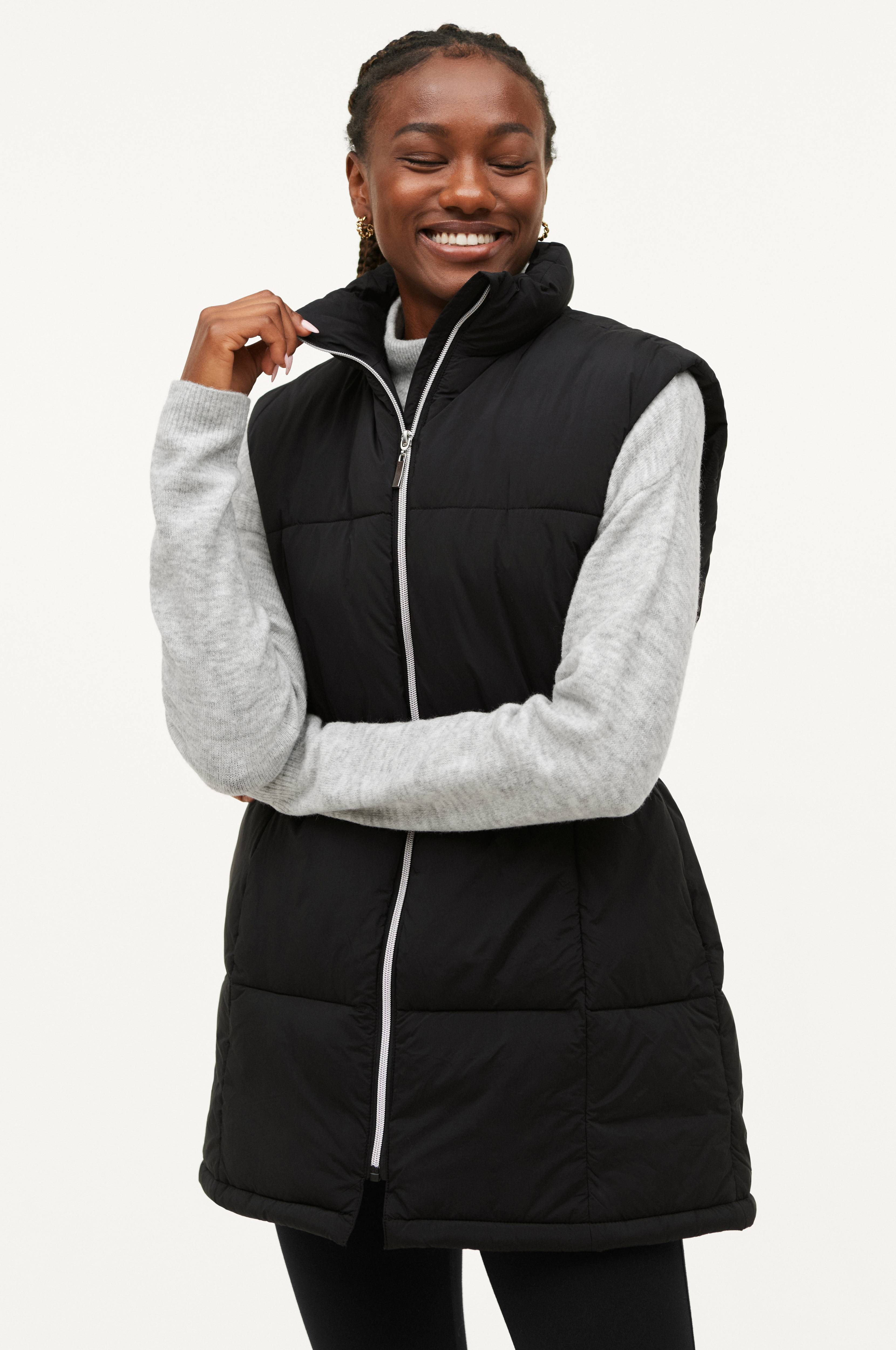 Vest i lang, vatteret model med indsat elastik i taljen. Lynlås foran og høj, vatteret krave. Indsatte lommer i sidesømmene. Længde ca. 78 cm i str. 34/36.