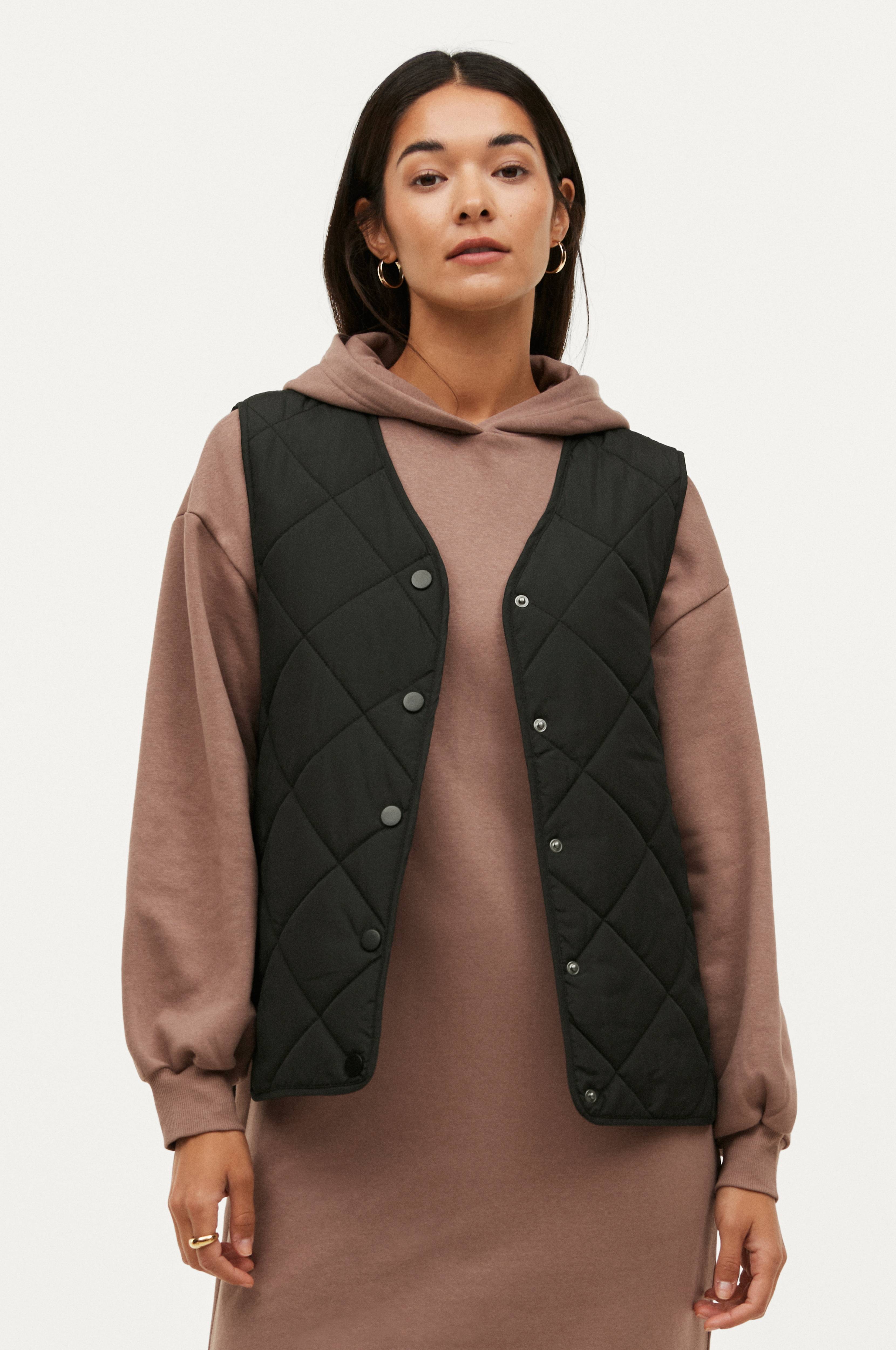Quiltet og let vatteret vest med V-hals og trykknap. Længde ca. 68 cm i str. 34/36.