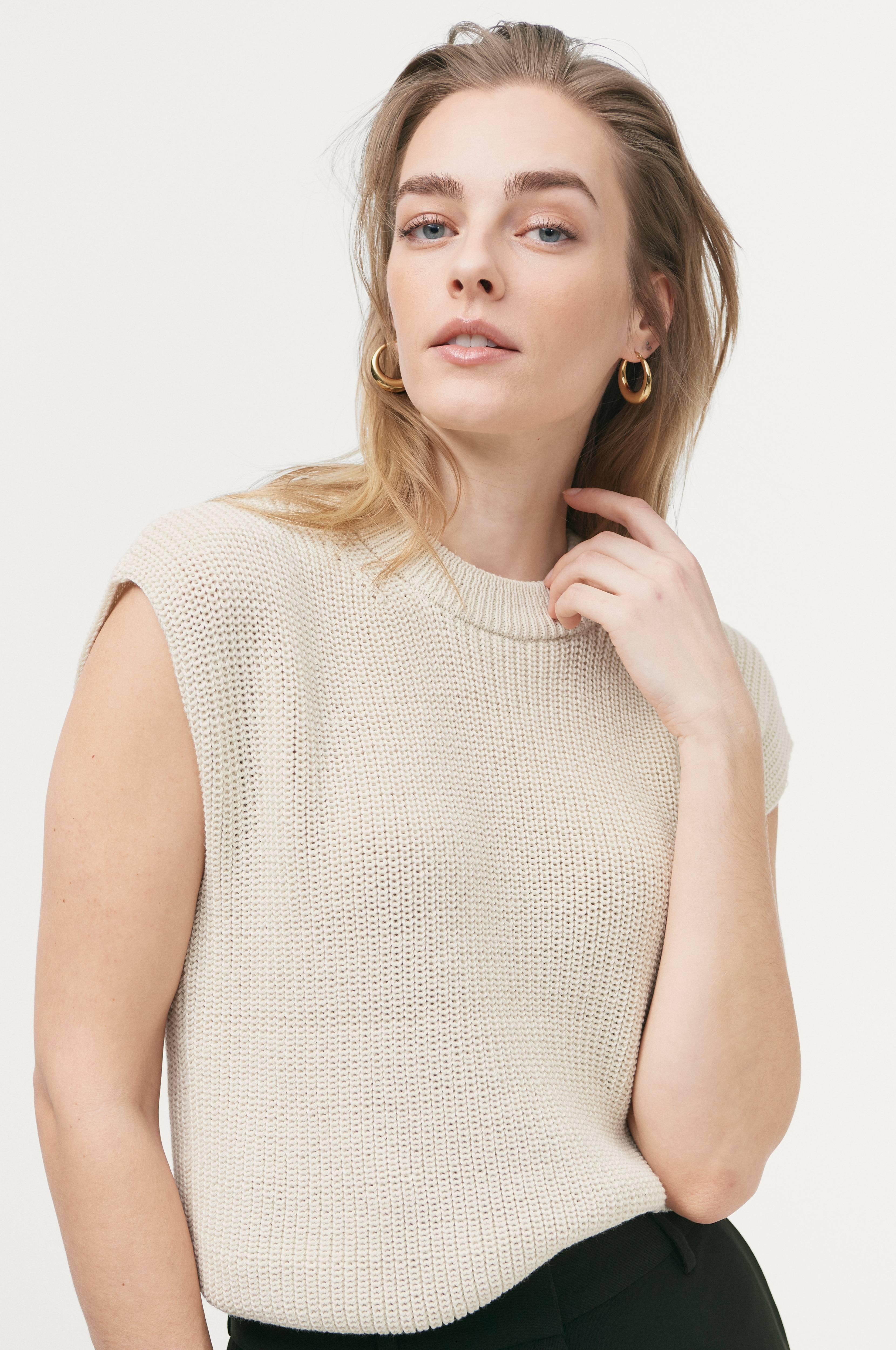 Ærmeløs, strikket trøje med rund, ribstrikket hals og sideslids forneden. Længde ca. 62 cm i str. 34/36.