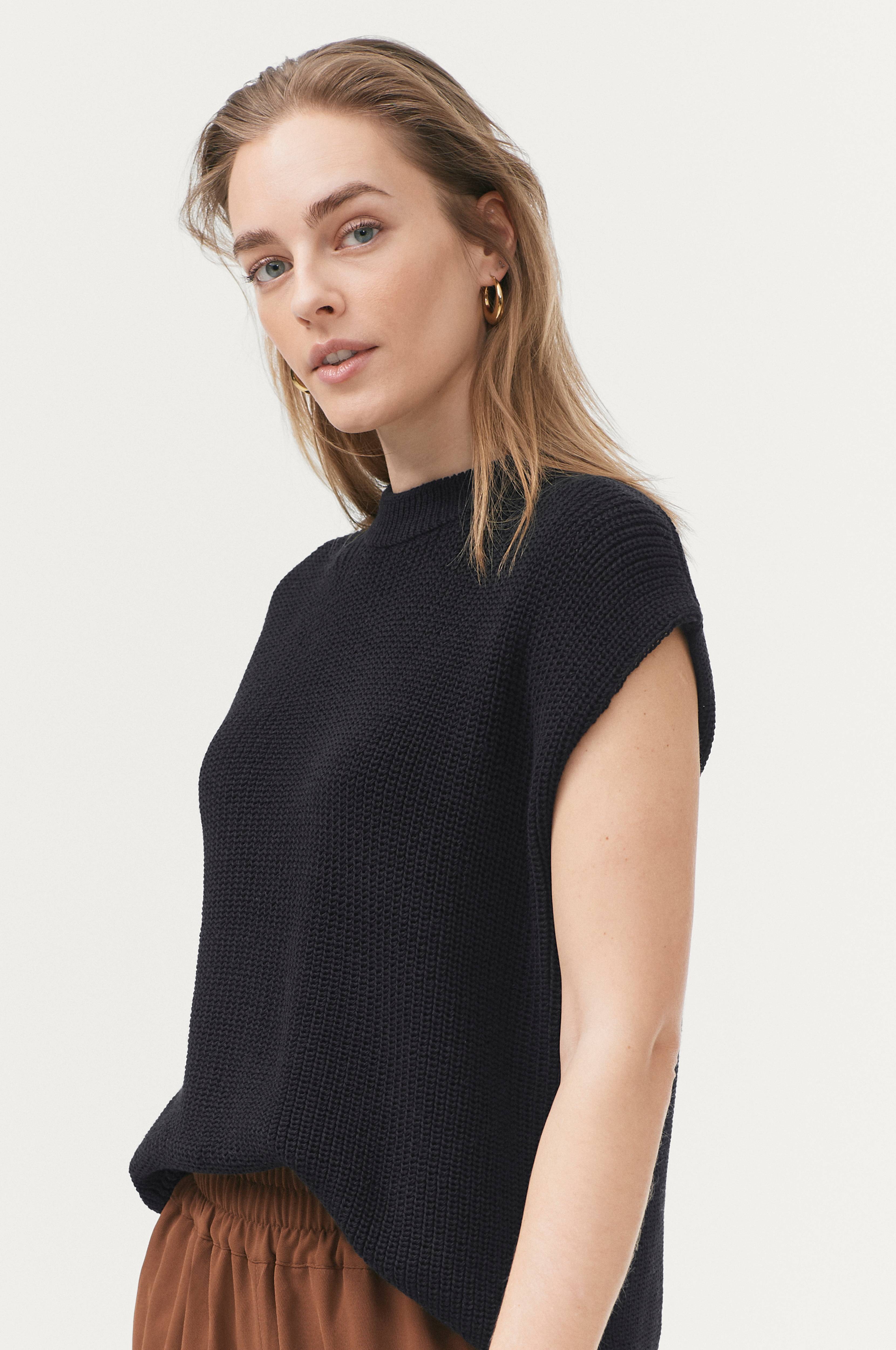 Ærmeløs, strikket trøje med rund, ribstrikket hals og sideslids forneden. Længde ca. 62 cm i str. 34/36.