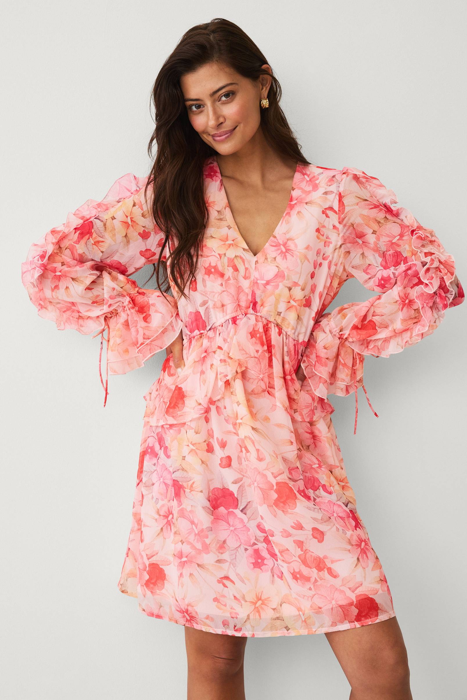 • Kjole med dekorative volanter• V-udskæring• Lange, semitransparente ærmer• Sløjfedetalje ved ærmeafslutningerne og ved taljen• Tekstilforing• Afslappet pasform• Længde: 96 cm i størrelse S
