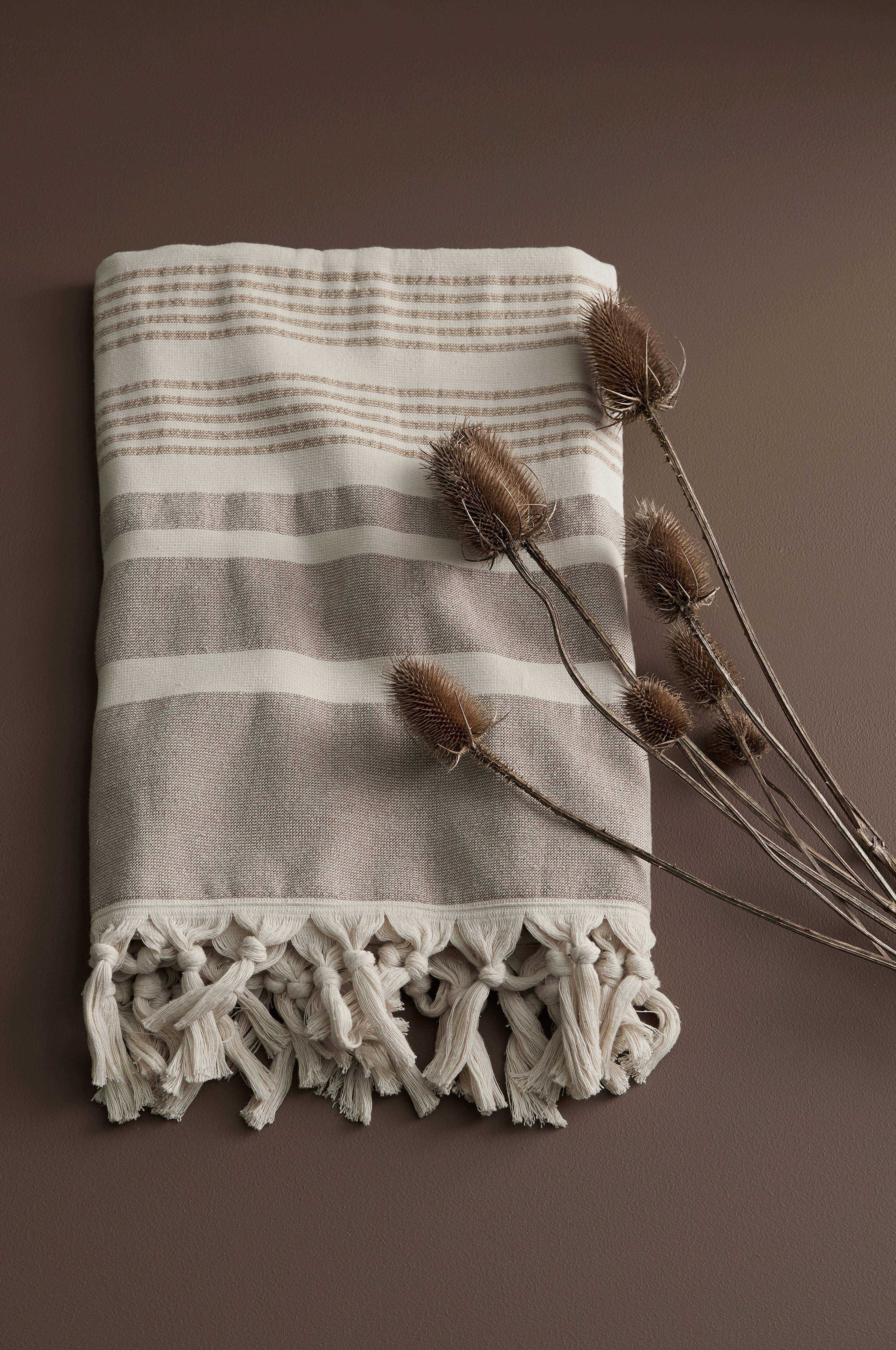 Hamam-håndklæde i bomuld med glat forside og bagside i frotté. Frynser i begge ender.