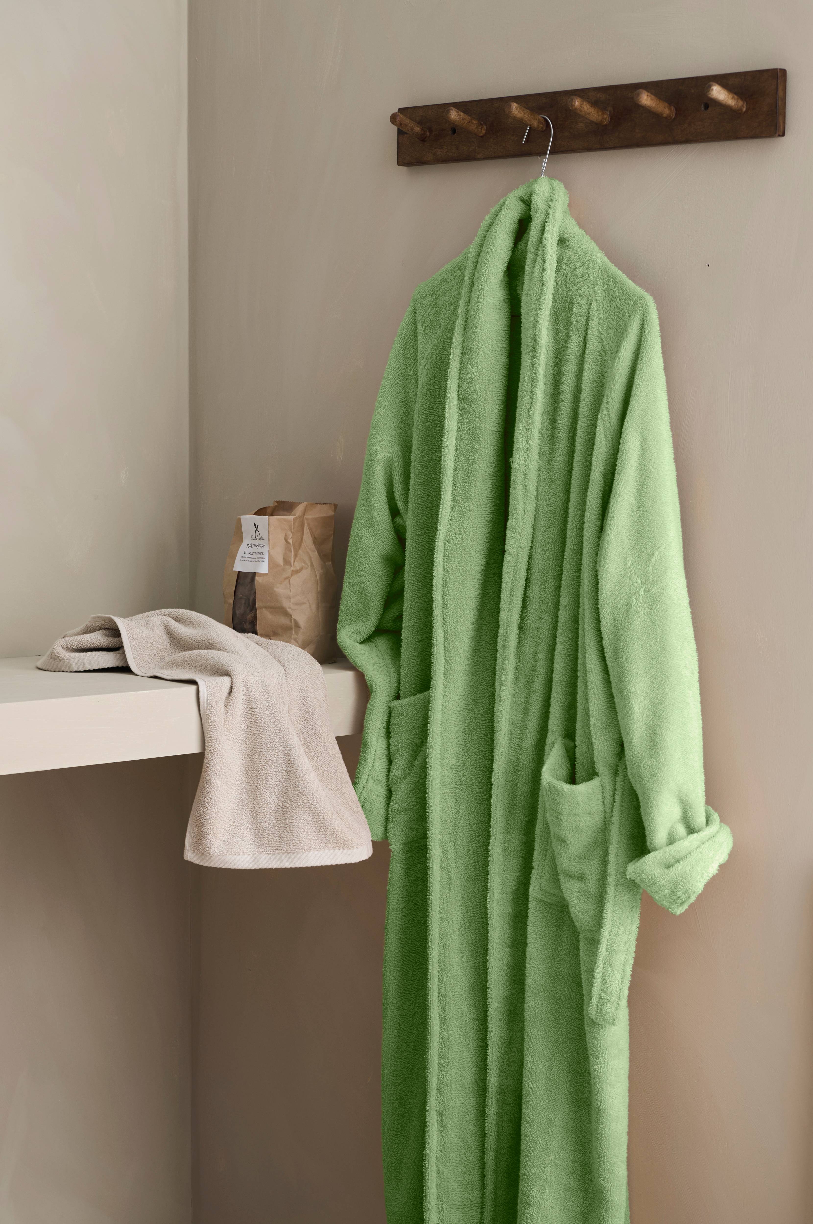 Badekåbe af 100% bomuldsfrotté med krave, to lommer og bindebælte. Længde 120 cm i str. 38/40.