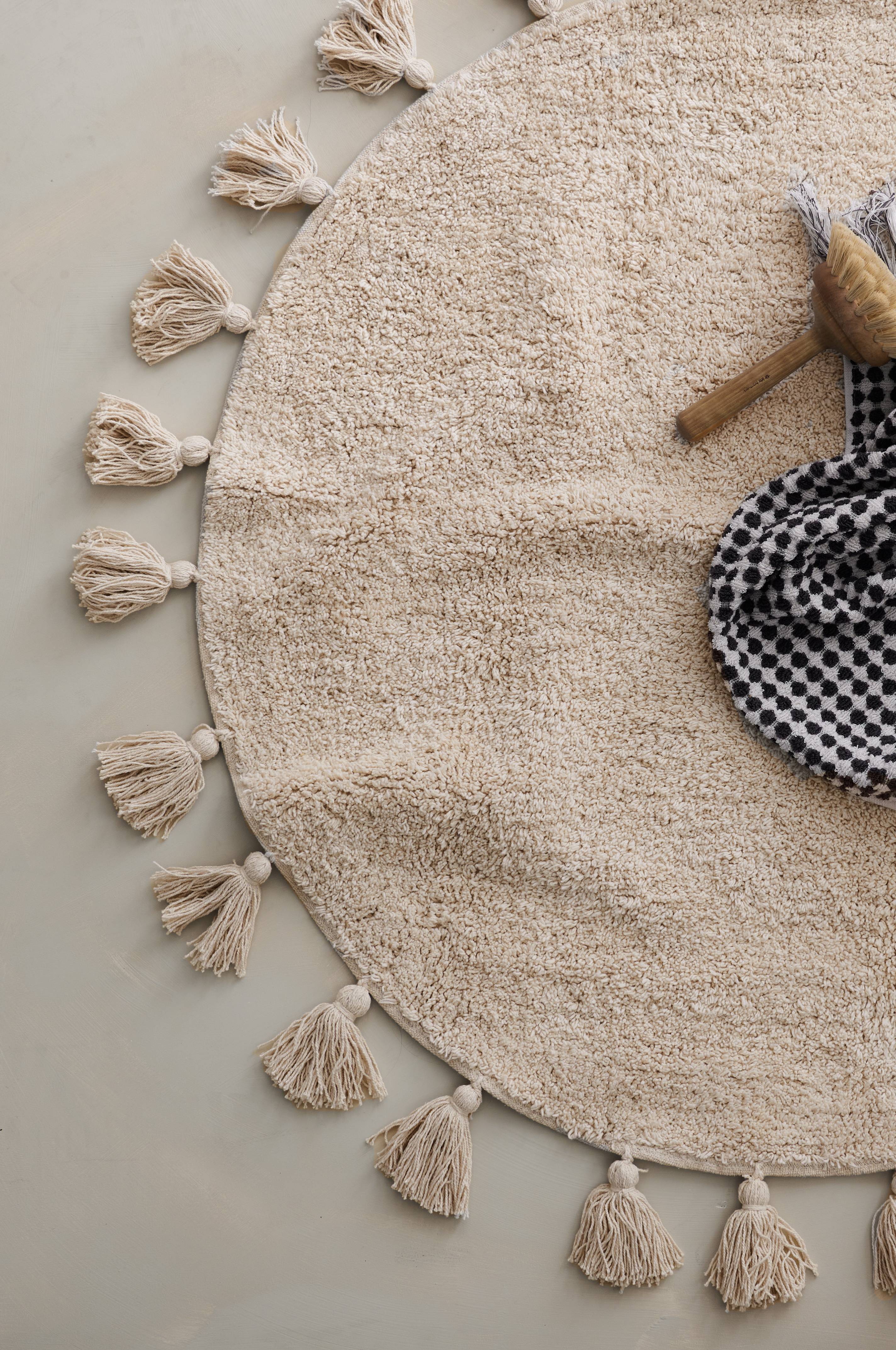 Rund, tuftet badeværelsesmåtte i bomuld med kvaste rundt om.