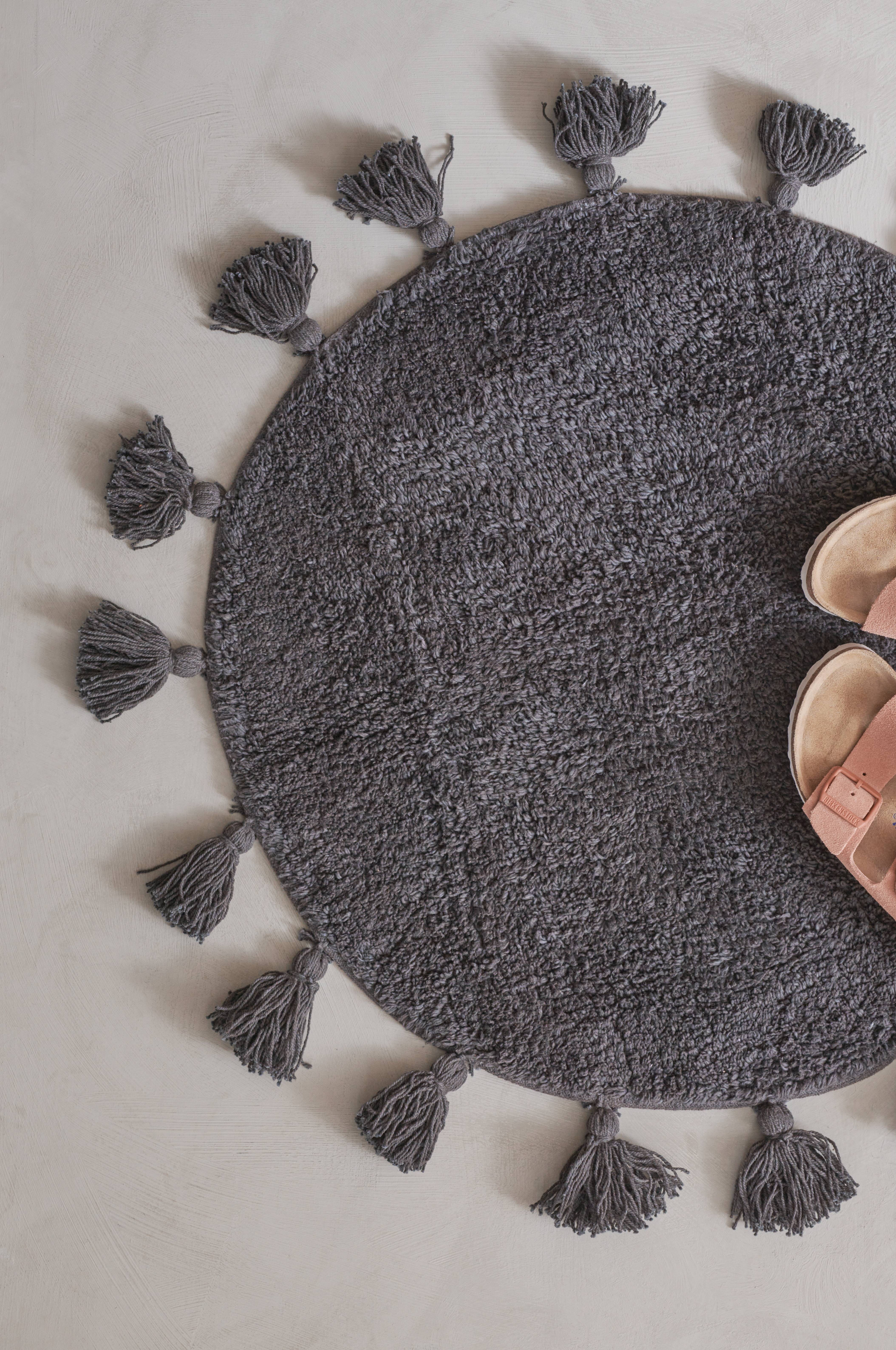 Rund, tuftet badeværelsesmåtte i bomuld med kvaste rundt om.