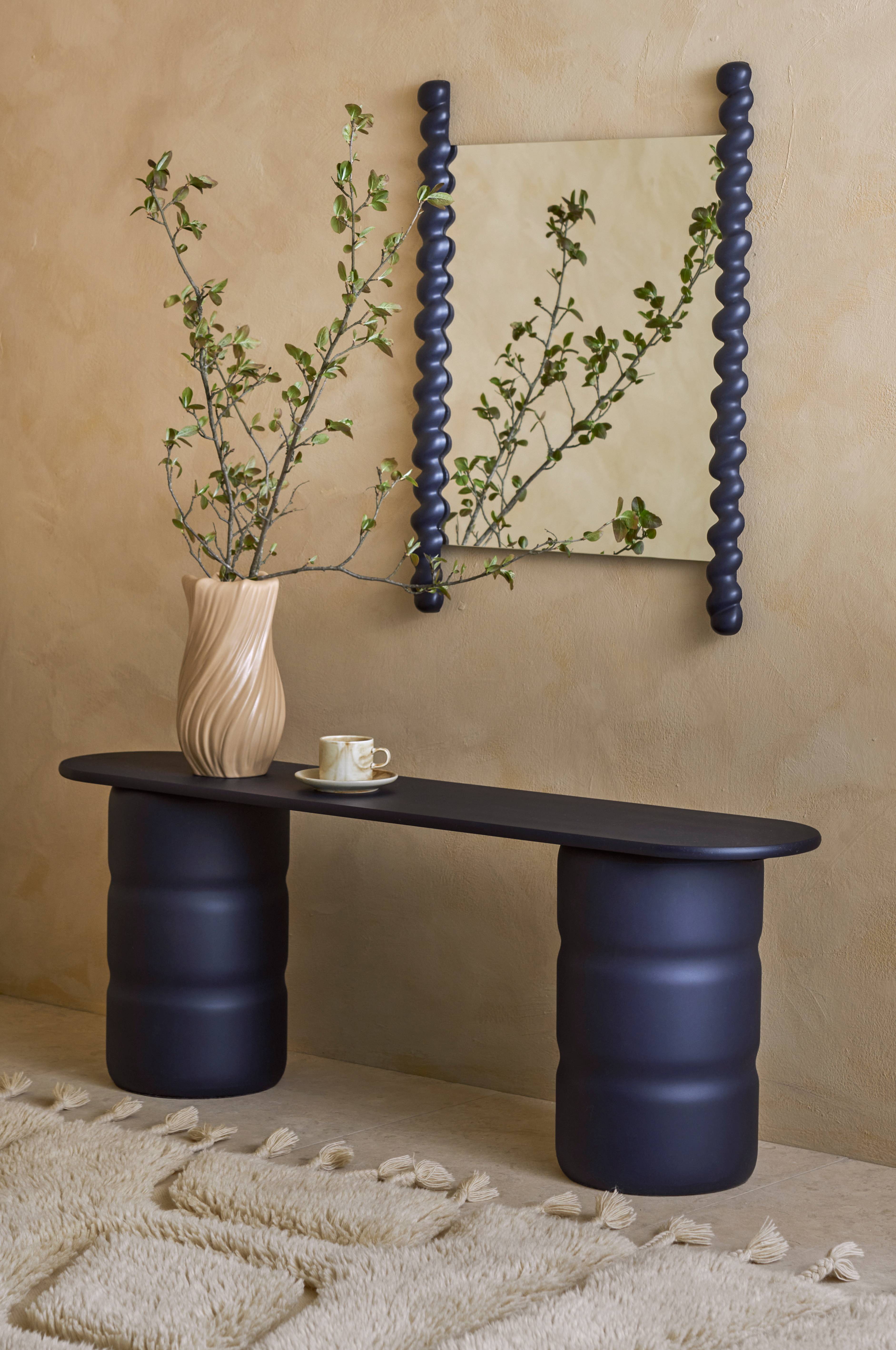 Bænk med kraftige, runde ben og satinfinish. Fremstillet i MDF med metalforstærkning på undersiden af bordpladen.