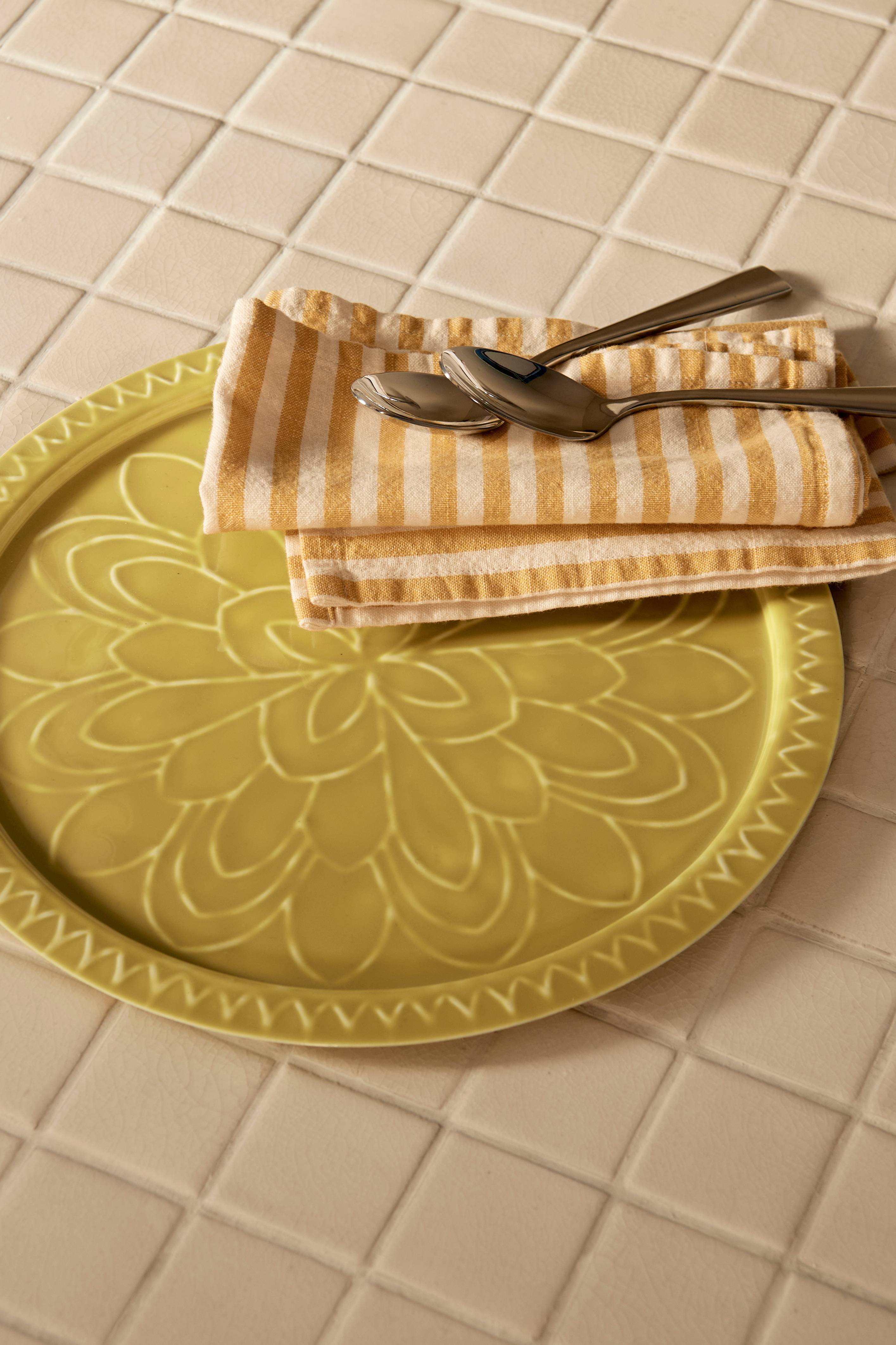 Et smykke til køkkenet, der står lænet op ad fliserne.