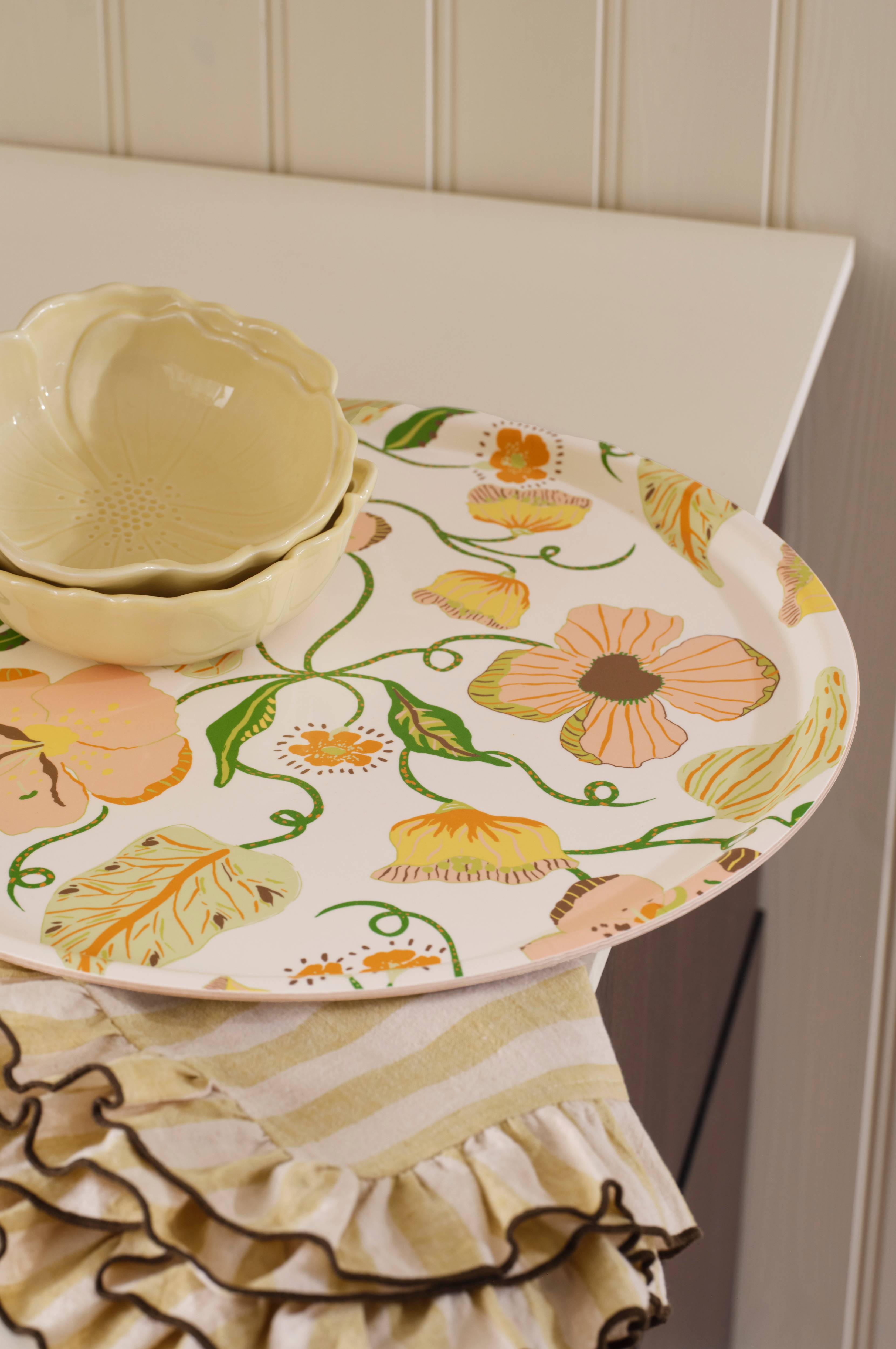 • Rund, håndlavet bakke i birk• Lamineret, slidstærk overflade med printet blomstermønster• Tåler opvaskemaskine