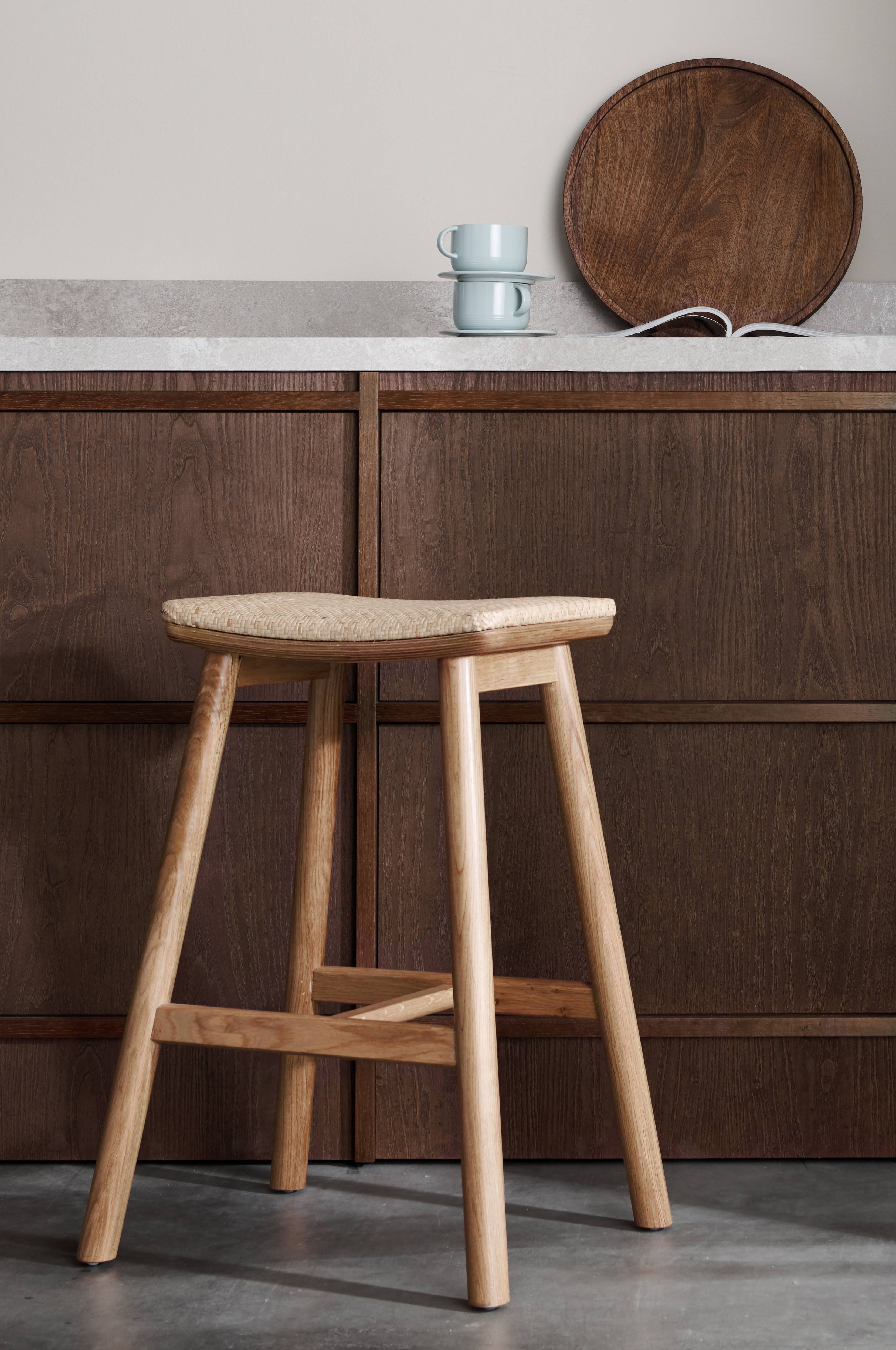 Stabil barstol i eg med vatteret sæde i flettet rotting. Bredde 47,5 cm, højde 66 cm, dybde 40 cm. Siddehøjde 65,5 cm. Sæde: 29 x 40 cm. Samlet.
