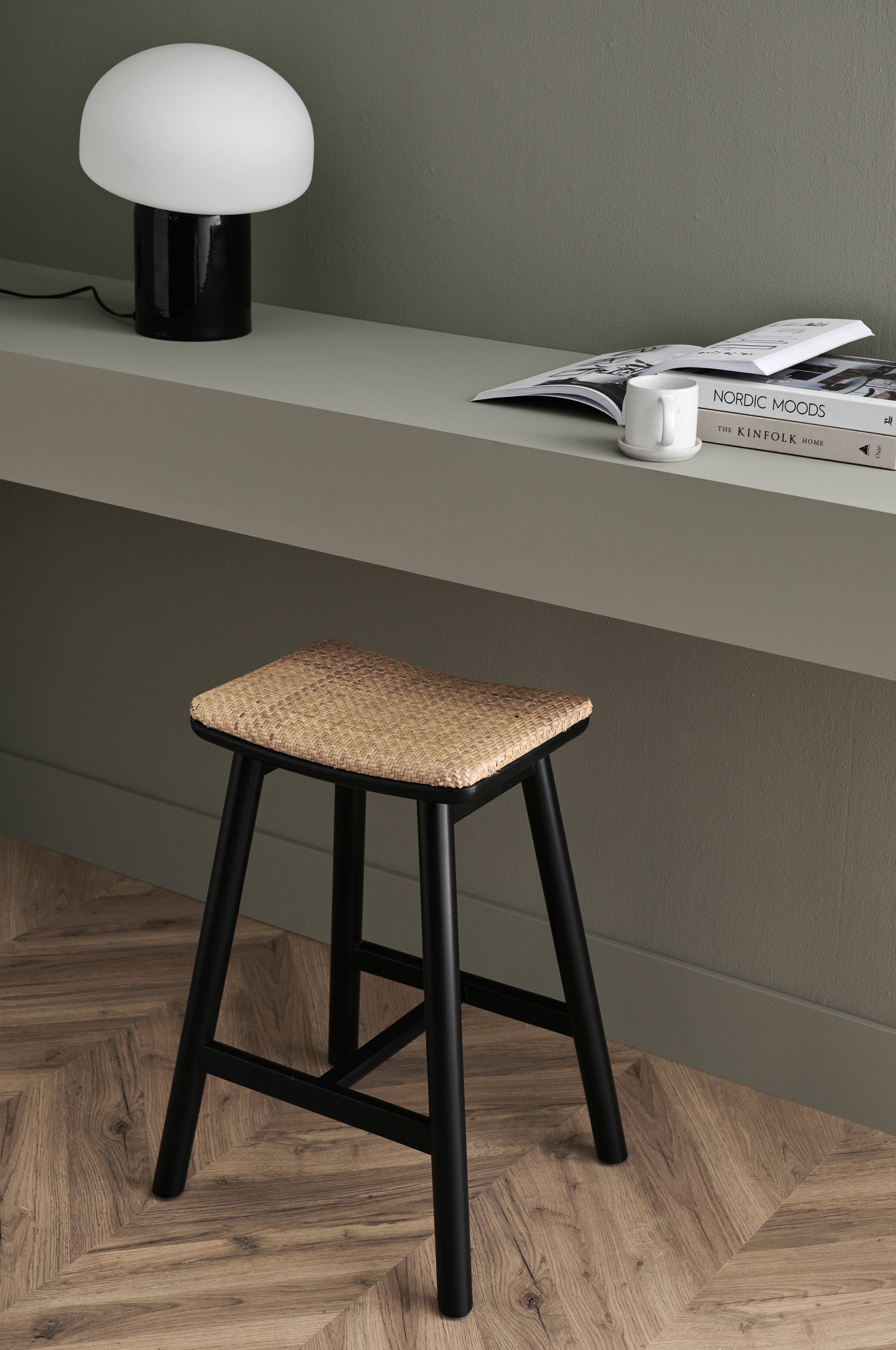 Stabil barstol i eg med vatteret sæde i flettet rotting. Bredde 47,5 cm, højde 66 cm, dybde 40 cm. Siddehøjde 65,5 cm. Sæde: 29 x 40 cm. Samlet.
