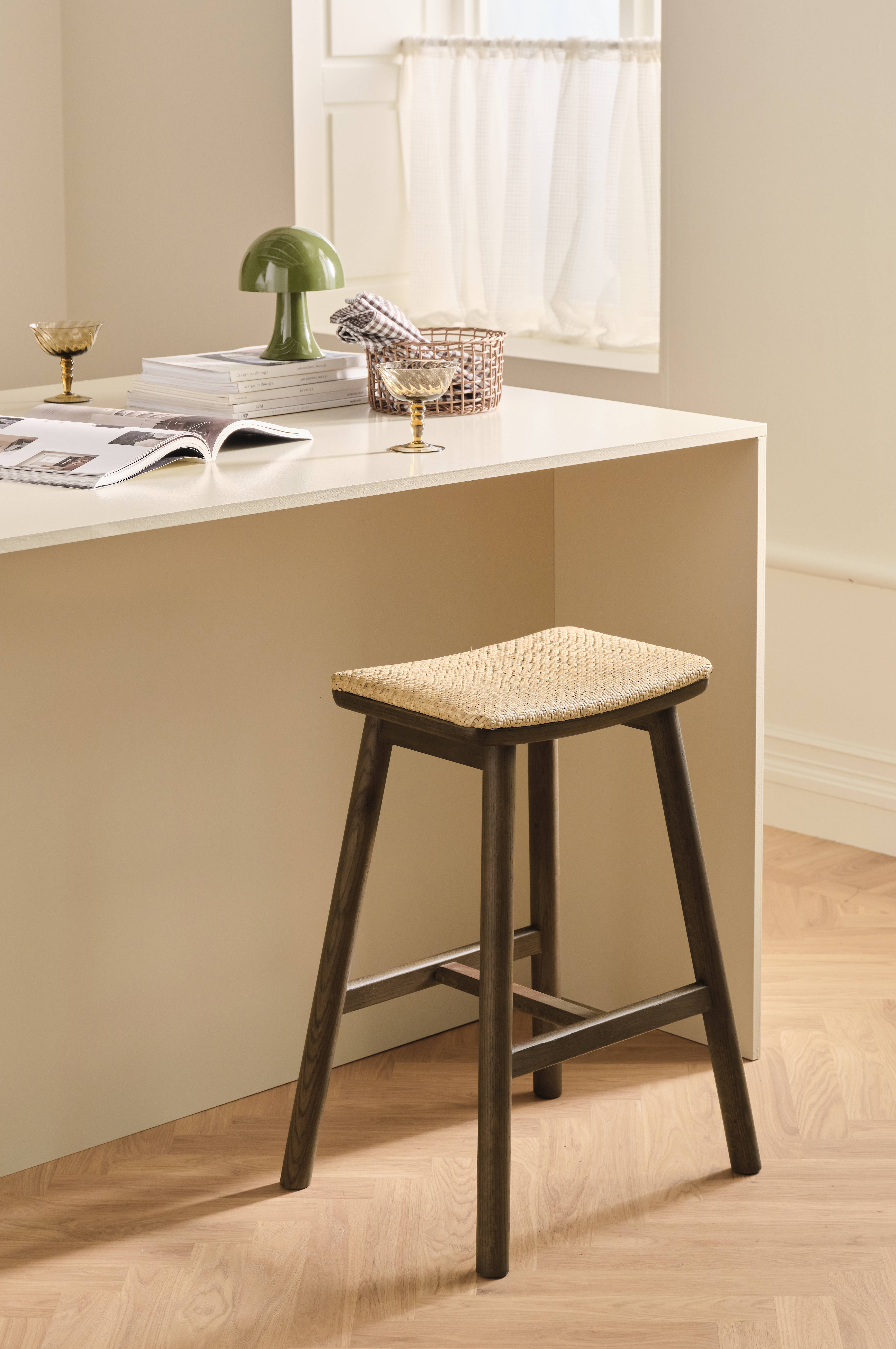 Stabil barstol i eg med vatteret sæde i flettet rotting. Bredde 47,5 cm, højde 66 cm, dybde 40 cm. Siddehøjde 65,5 cm. Sæde: 29 x 40 cm. Samlet.