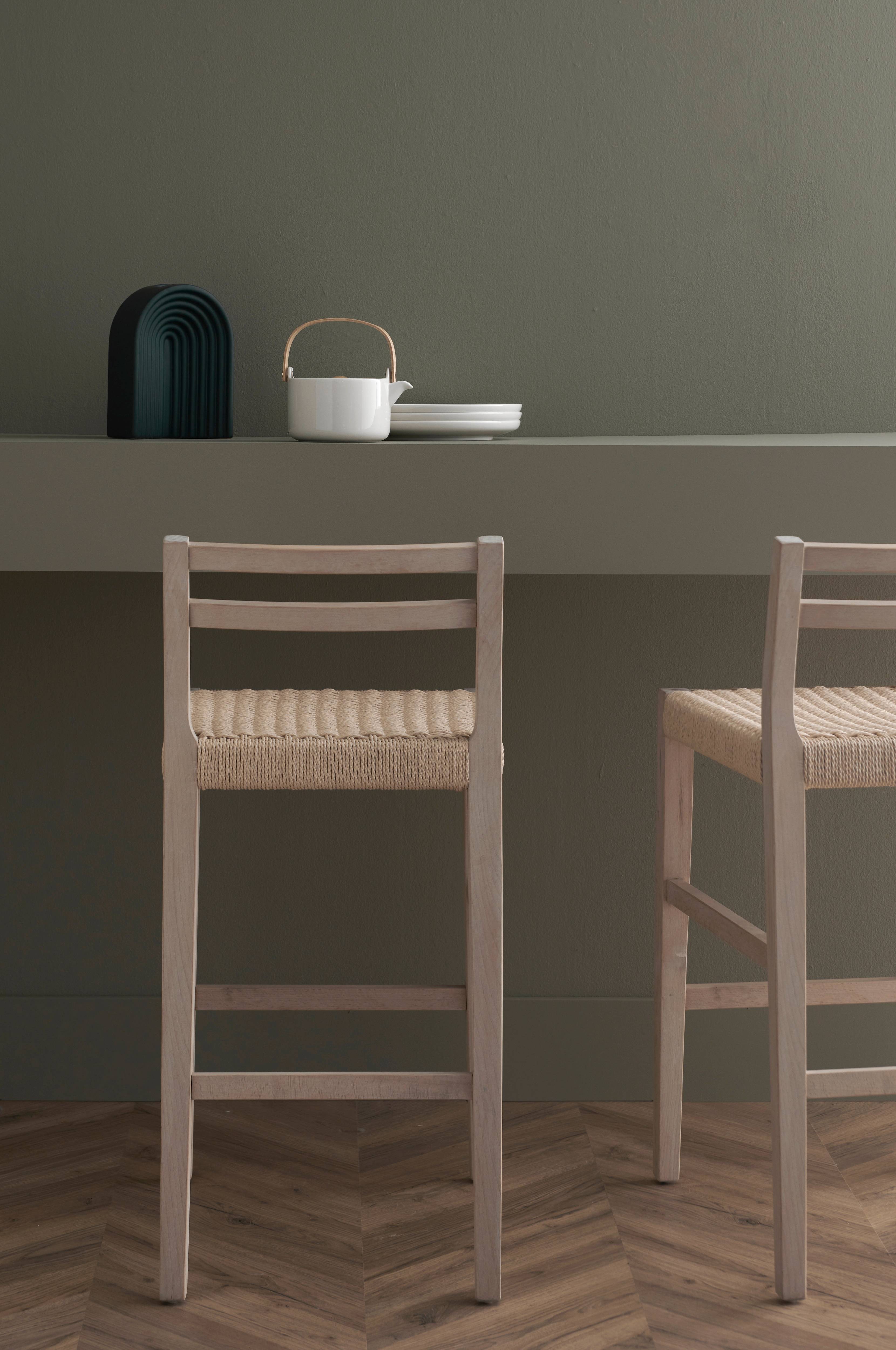 Barstol i lakeret bøgetræ med sæde af flettet jutereb. Højde til fodstøtte 24 cm.