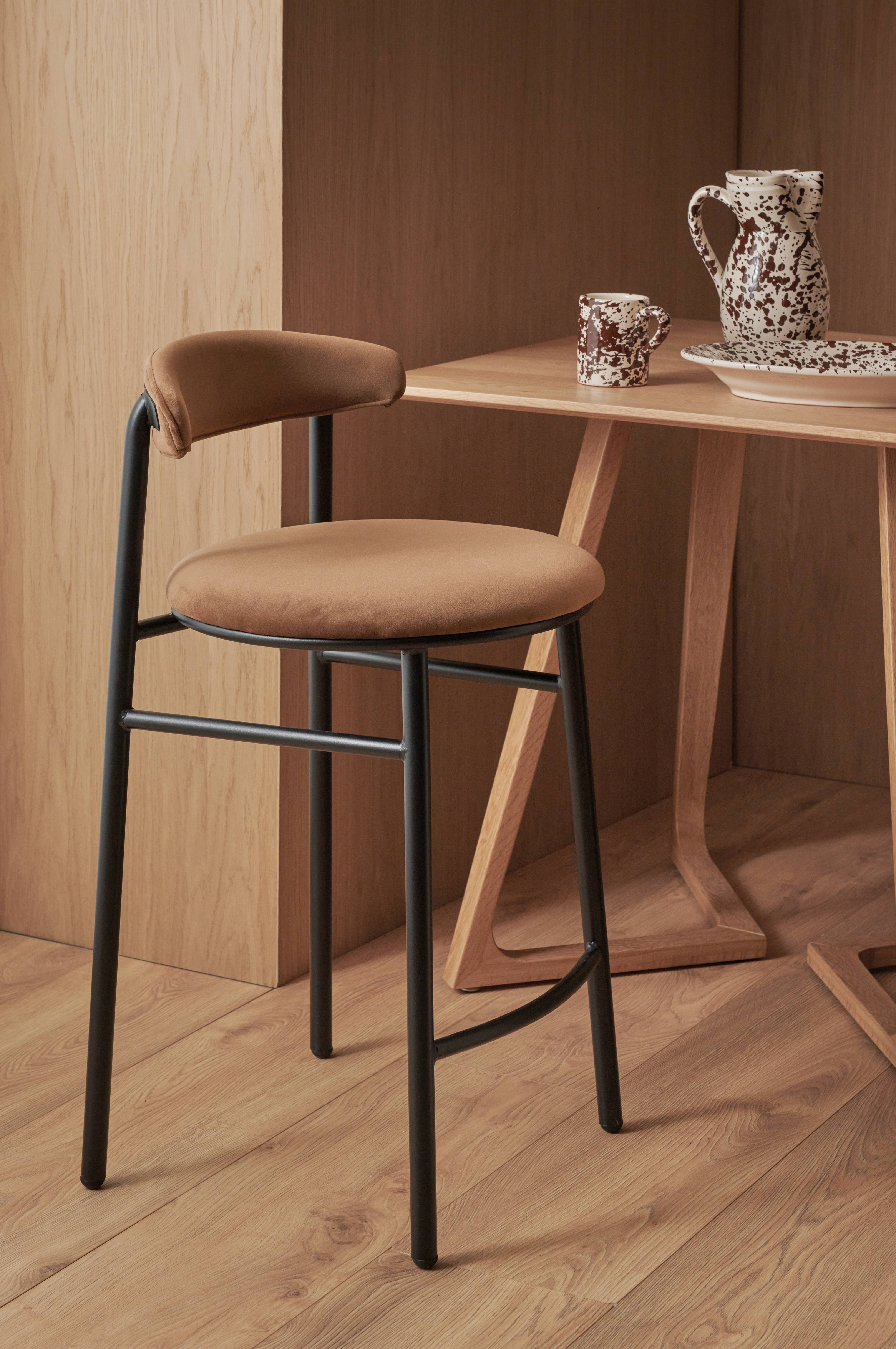 Barstol i moderne design med rundt sæde og svungen ryg. Stel og ben i metal. Sæde og ryg med skumfyld. Fodstøttens højde 22 cm.