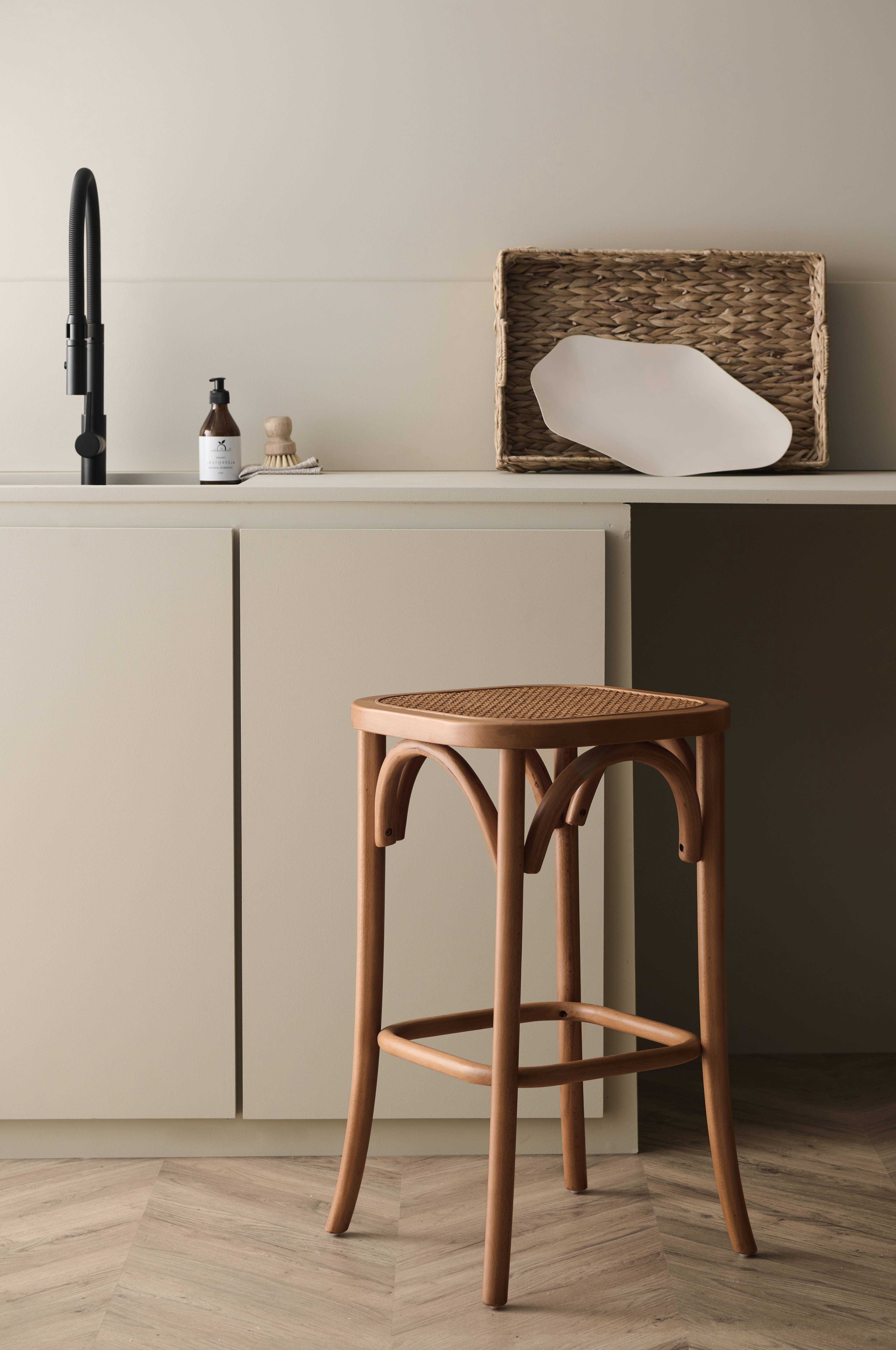 Barstol i birk med forstærket rottingsæde og fodstøtte. Frihøjde under møbel 24 cm. Samlet.