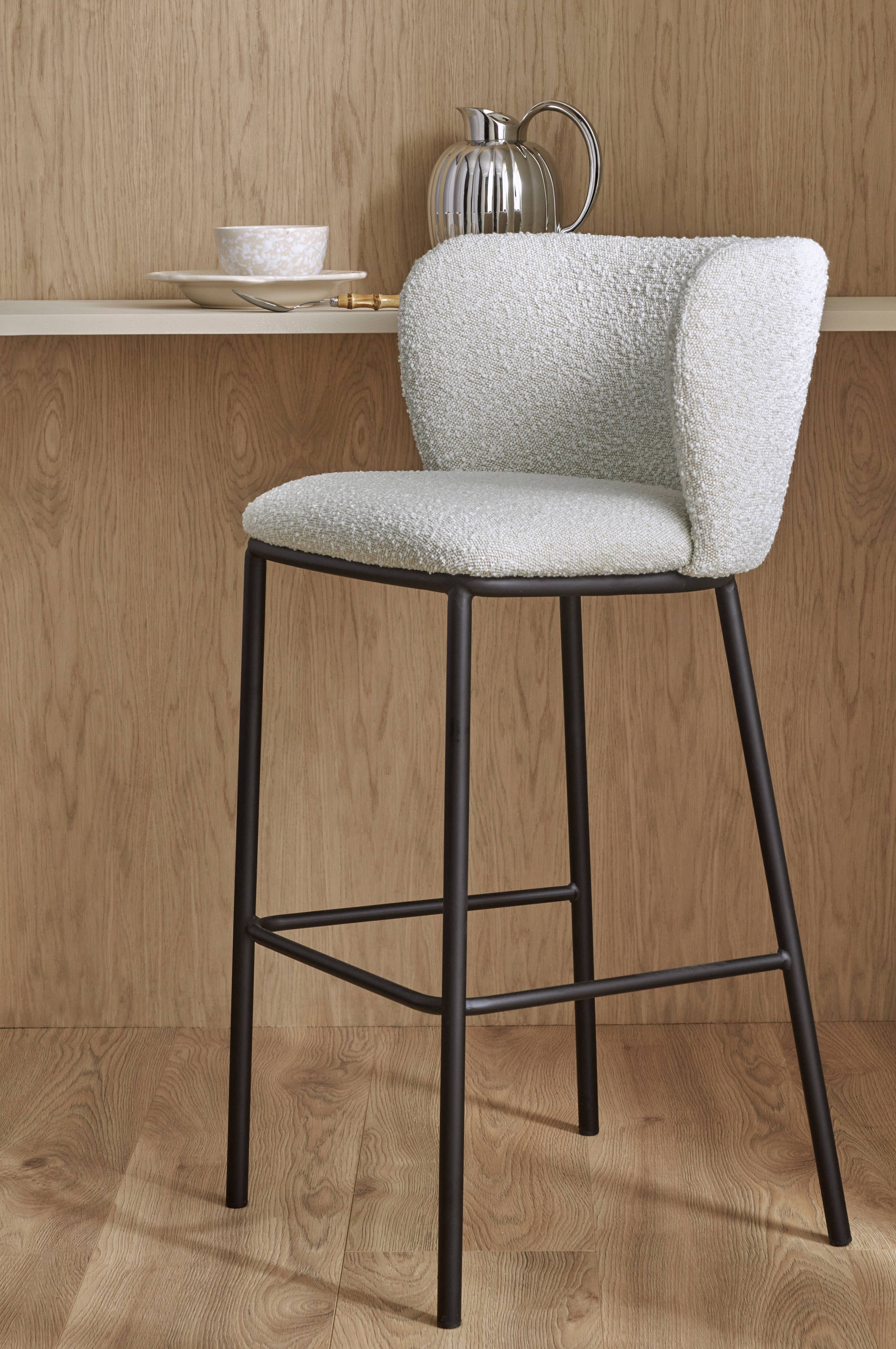 Barstol i skandinavisk, stilren design med skålformet ryglæn. Betræk i bouclé med skumfyld. Ben af metal. Ryglæn højde 27 cm. Maks. belastning 150 kg. Sælges enkeltvis.