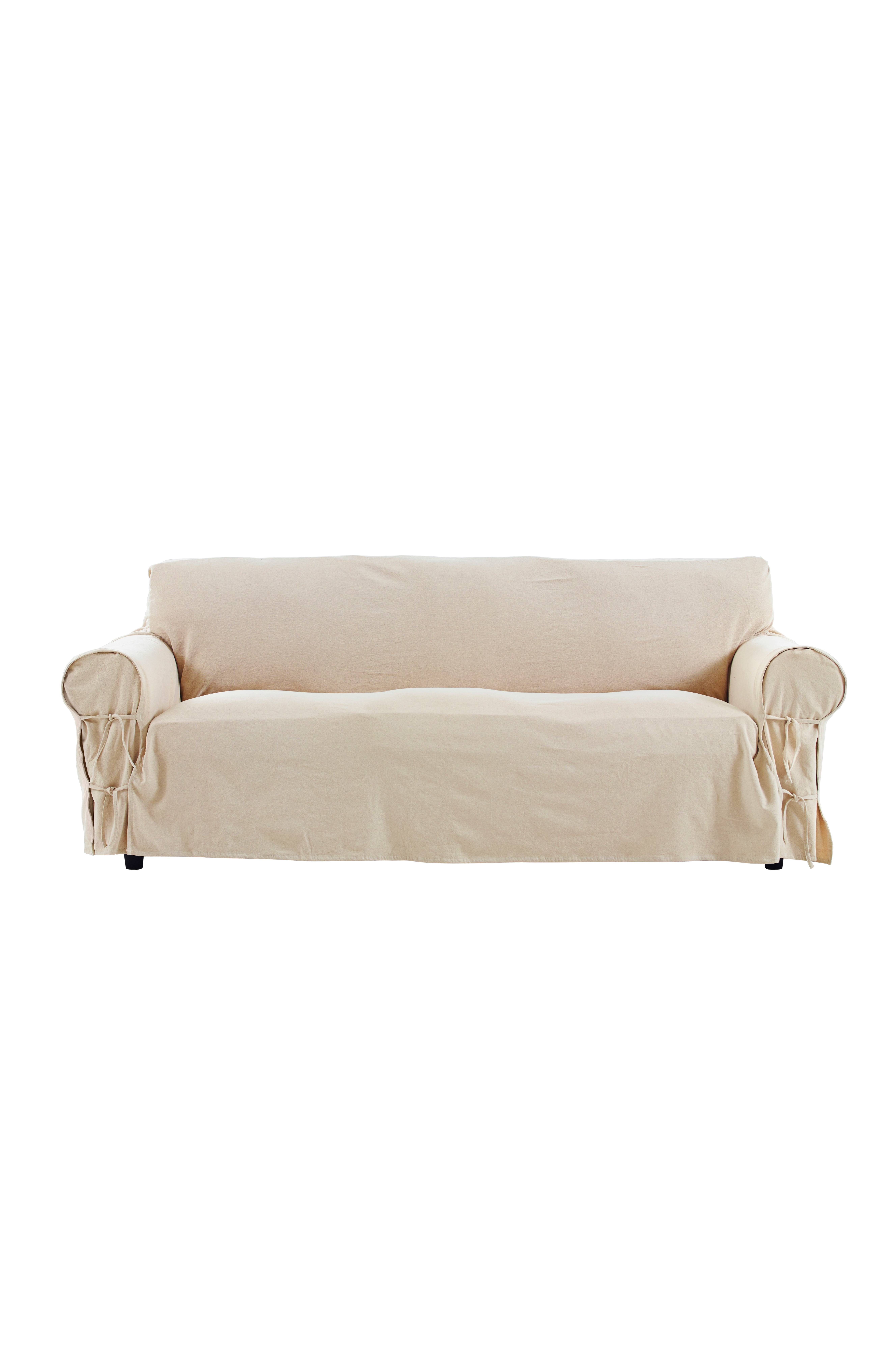 i kraftig, blødvasket kvalitet. Pasformen justeres med bindebånd ved armlænene. Sædebredde max 170 cm. Betræk i mørke farver anbefales ikke till lyse møbler. Sædebredde mellem armlæn ca. 185 cm.