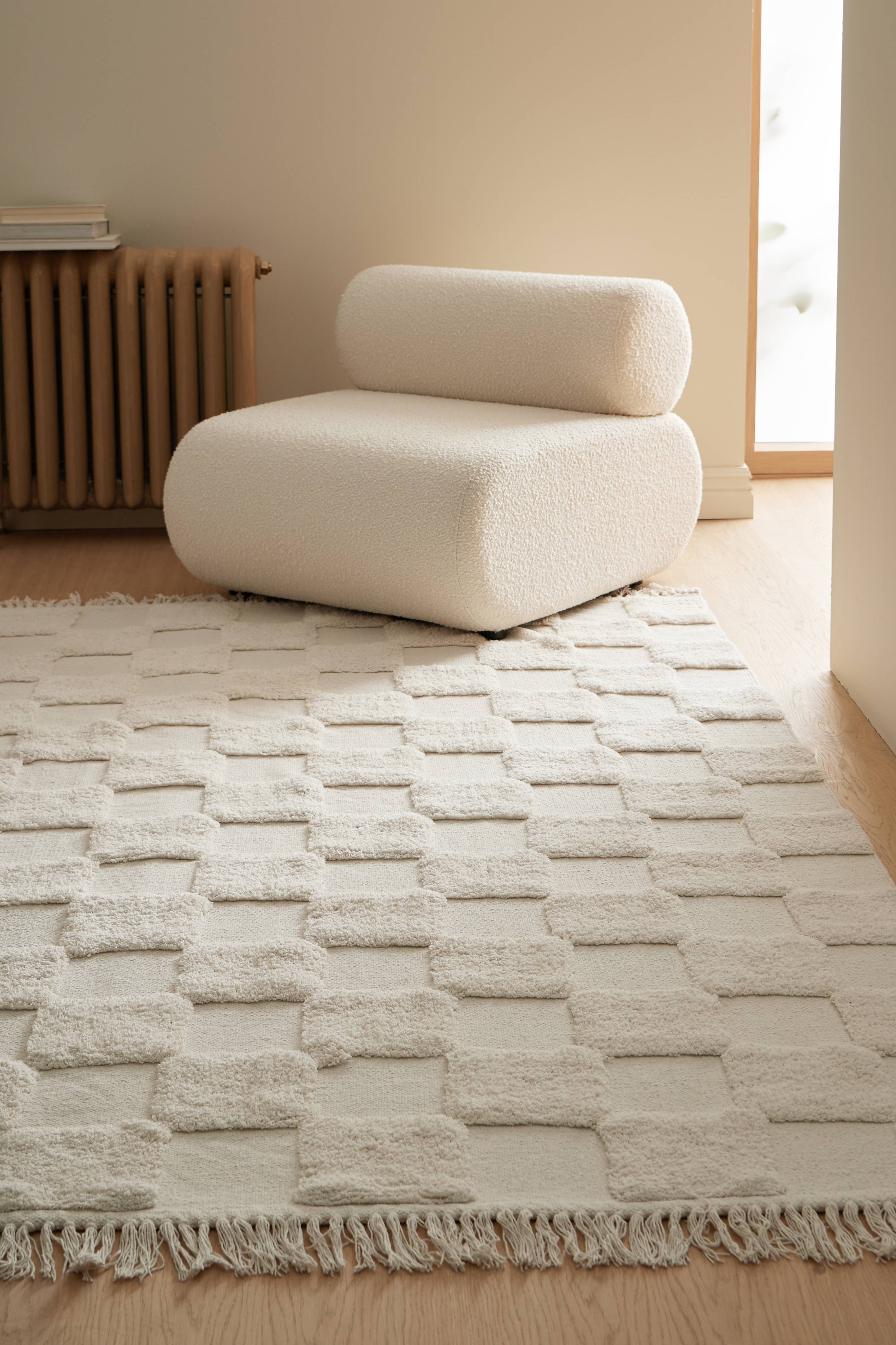 • Håndvævet bomuldsgulvtæppe med tuftet ternet mønster