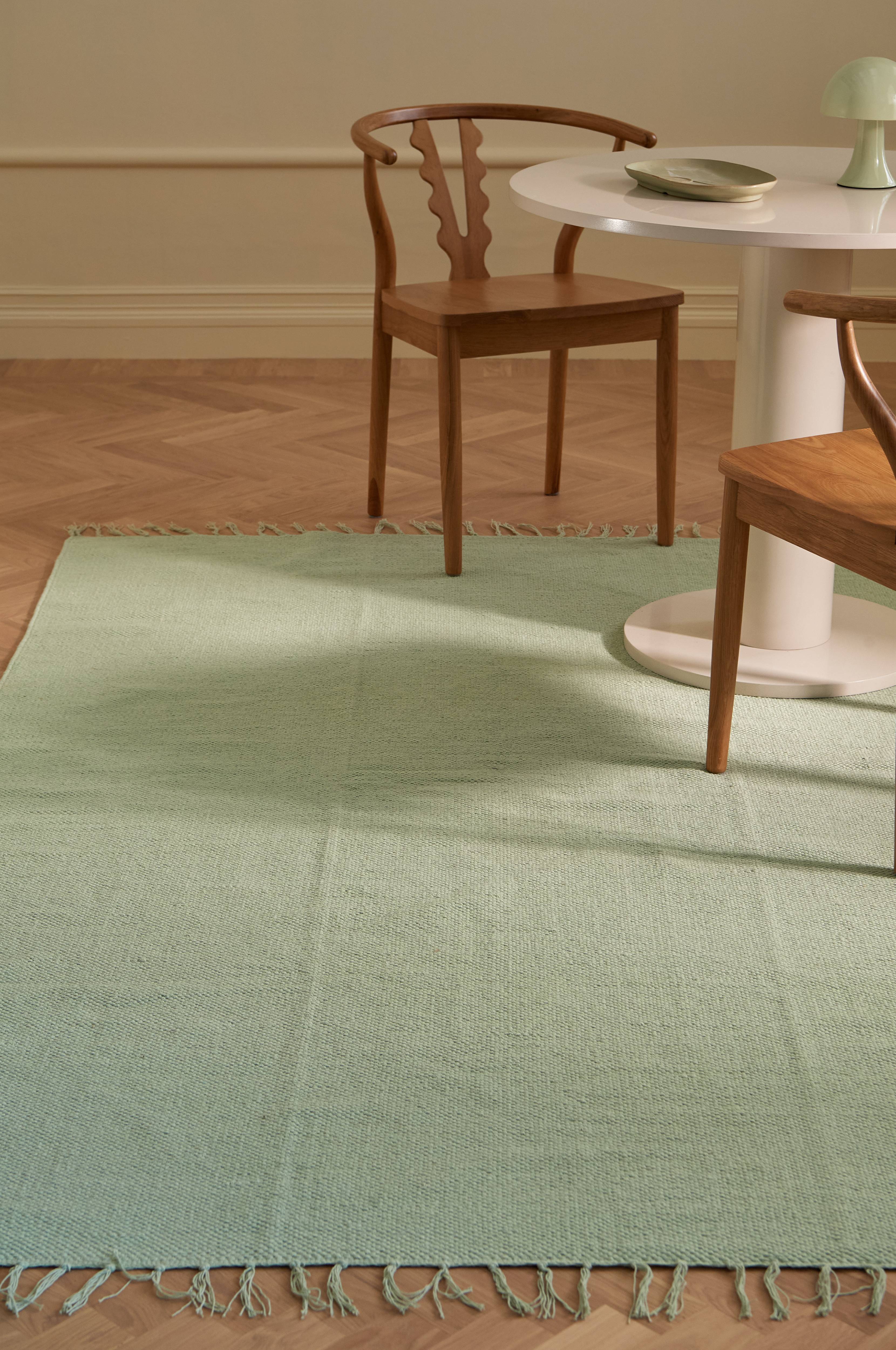 Glatvævet bomuldstæppe med farvede frynser. Højde 0,5 cm.