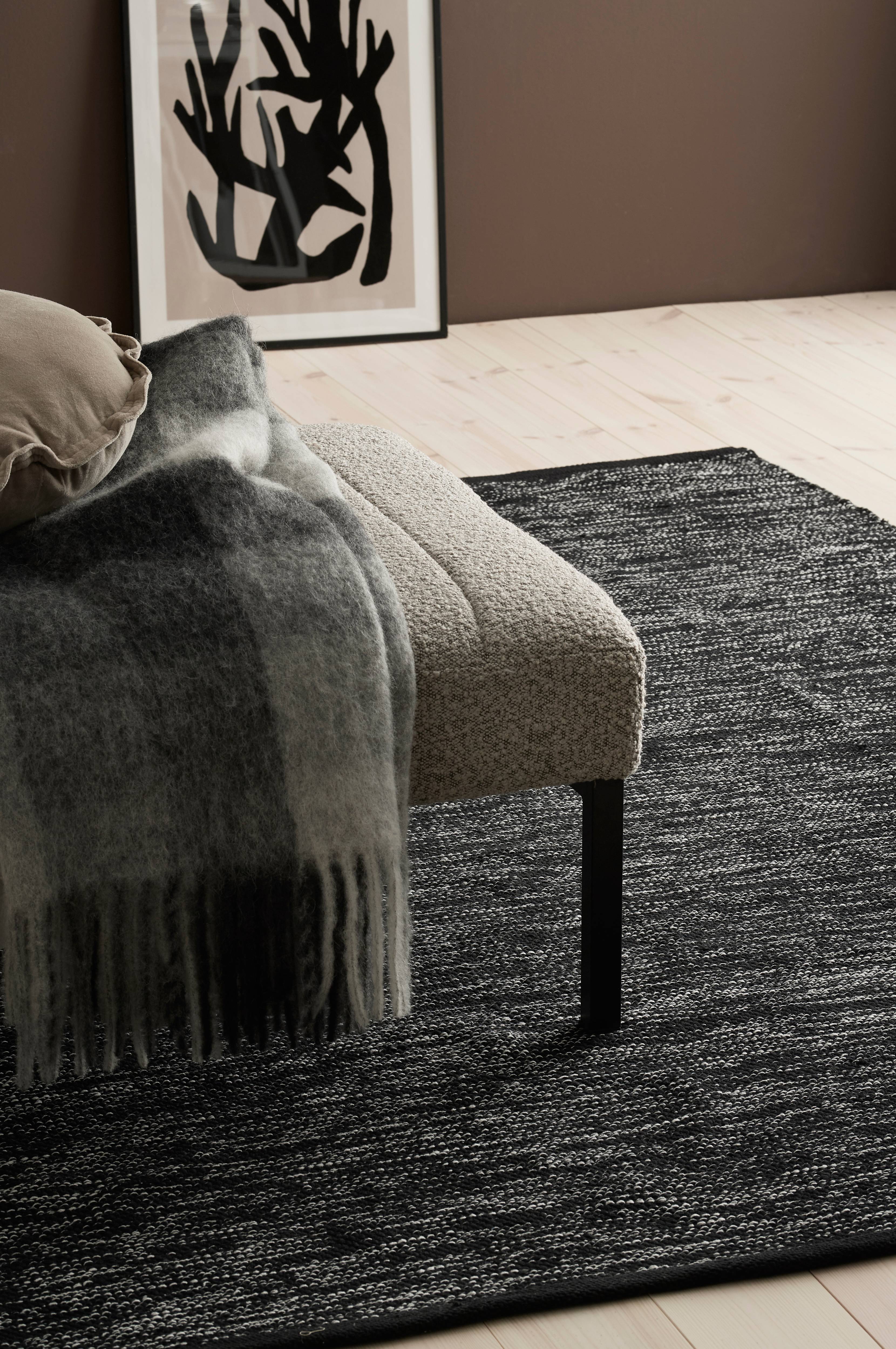 Glatvævet bomuldstæppe i melangefarvet garn med ensfarvede borter i enderne. Højde 0,5 cm.