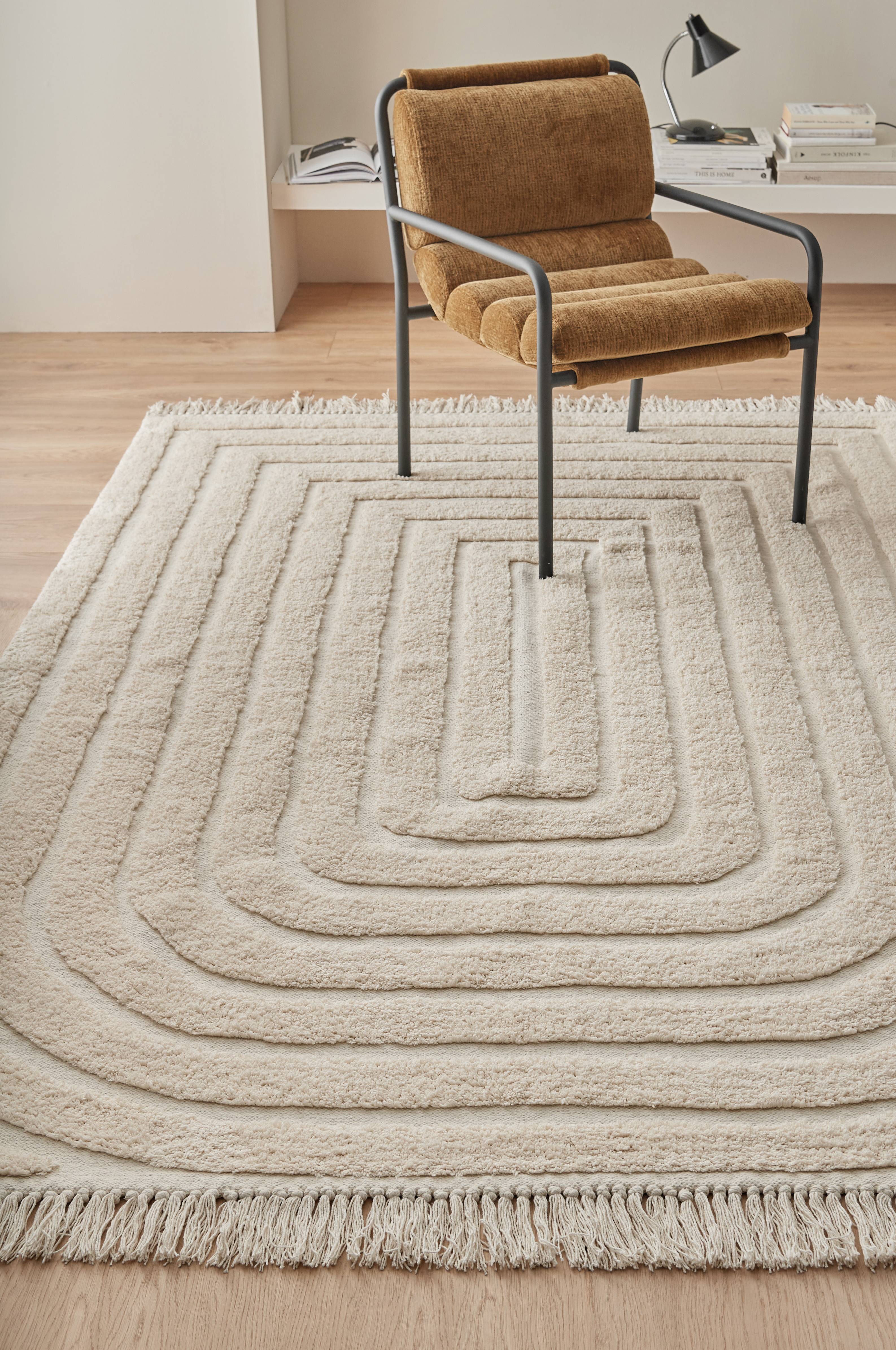 Håndvævet bomuldstæppe med tuftet mønster og knyttede frynser.
