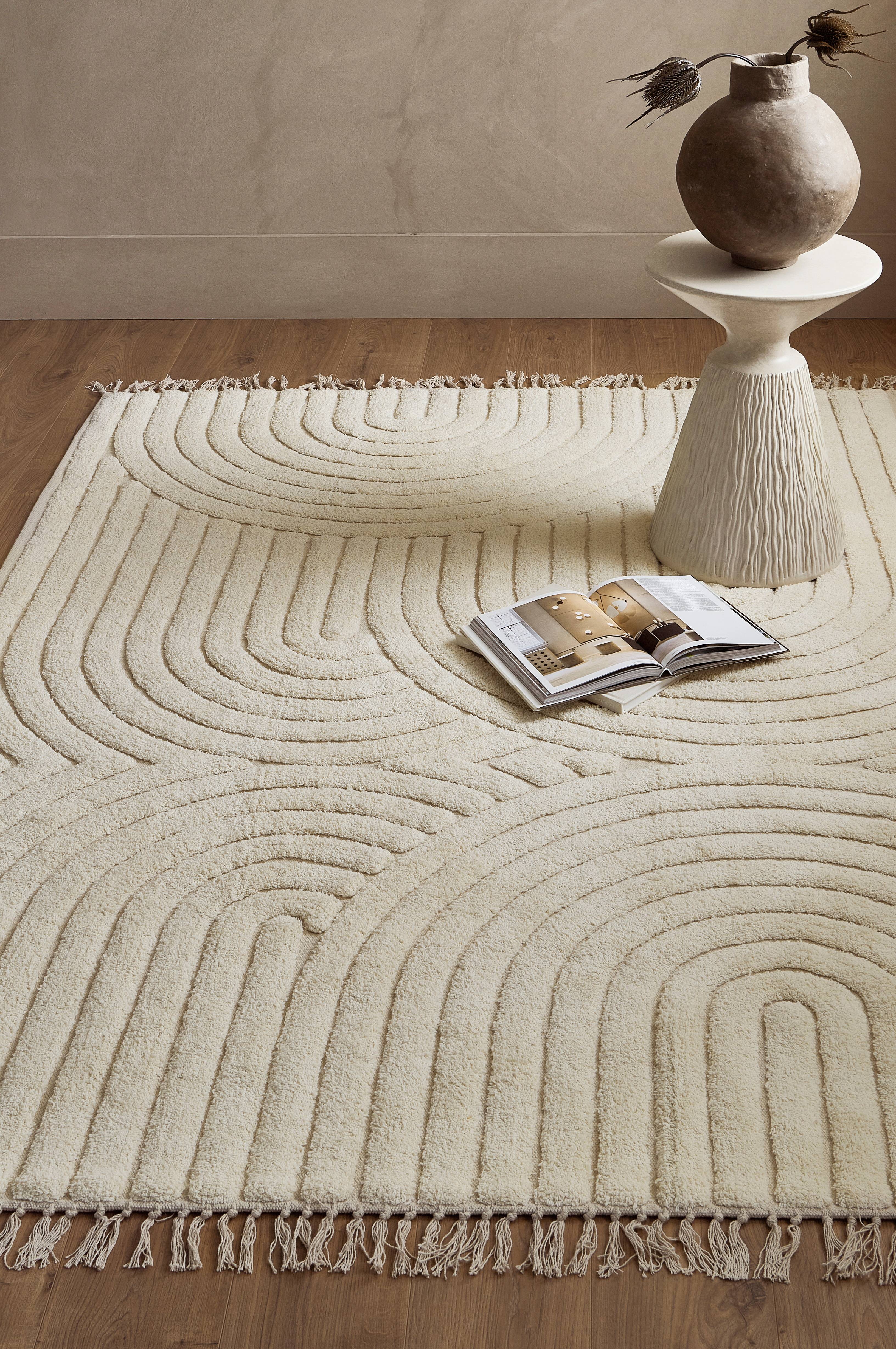 Håndvævet bomuldstæppe med tuftet mønster. Frynser i enderne.