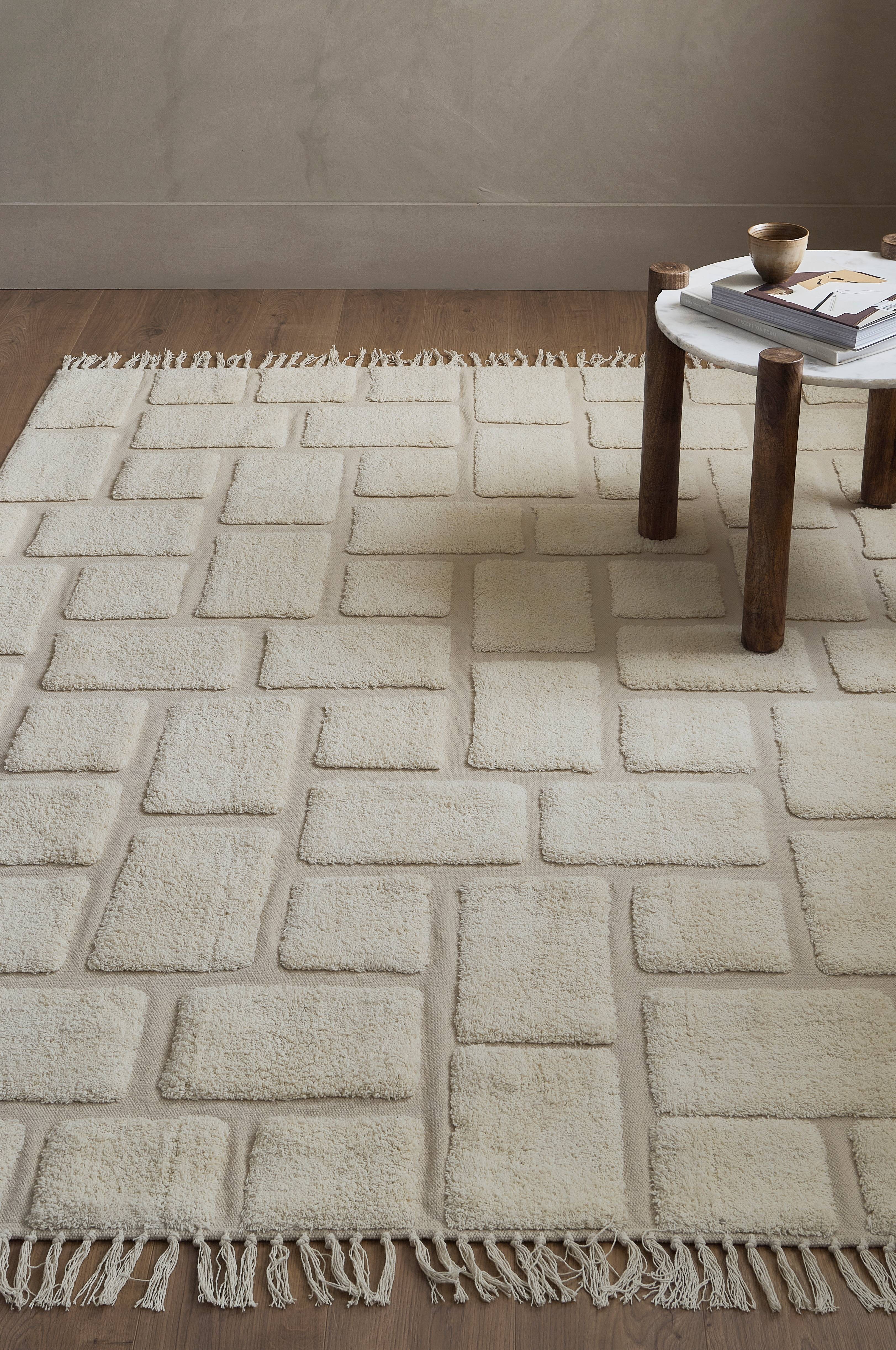 Håndvævet bomuldstæppe med tuftet mønster. Frynser i enderne.