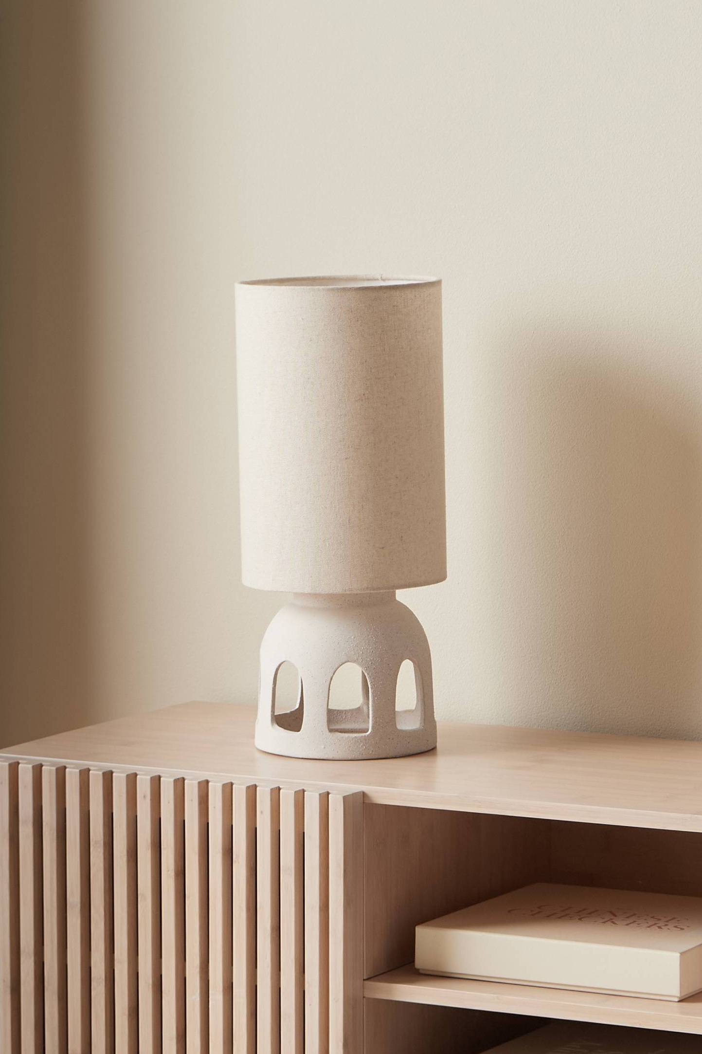 • Bordlampe med to lyskilder• Lampefod i keramik• Skærm i Tekstil af hør• Tekstilsnor med kontakt• Fatning E27. Lampen har også en G9-fatning i lampefoden. Lyskilder er ikke inkluderet.