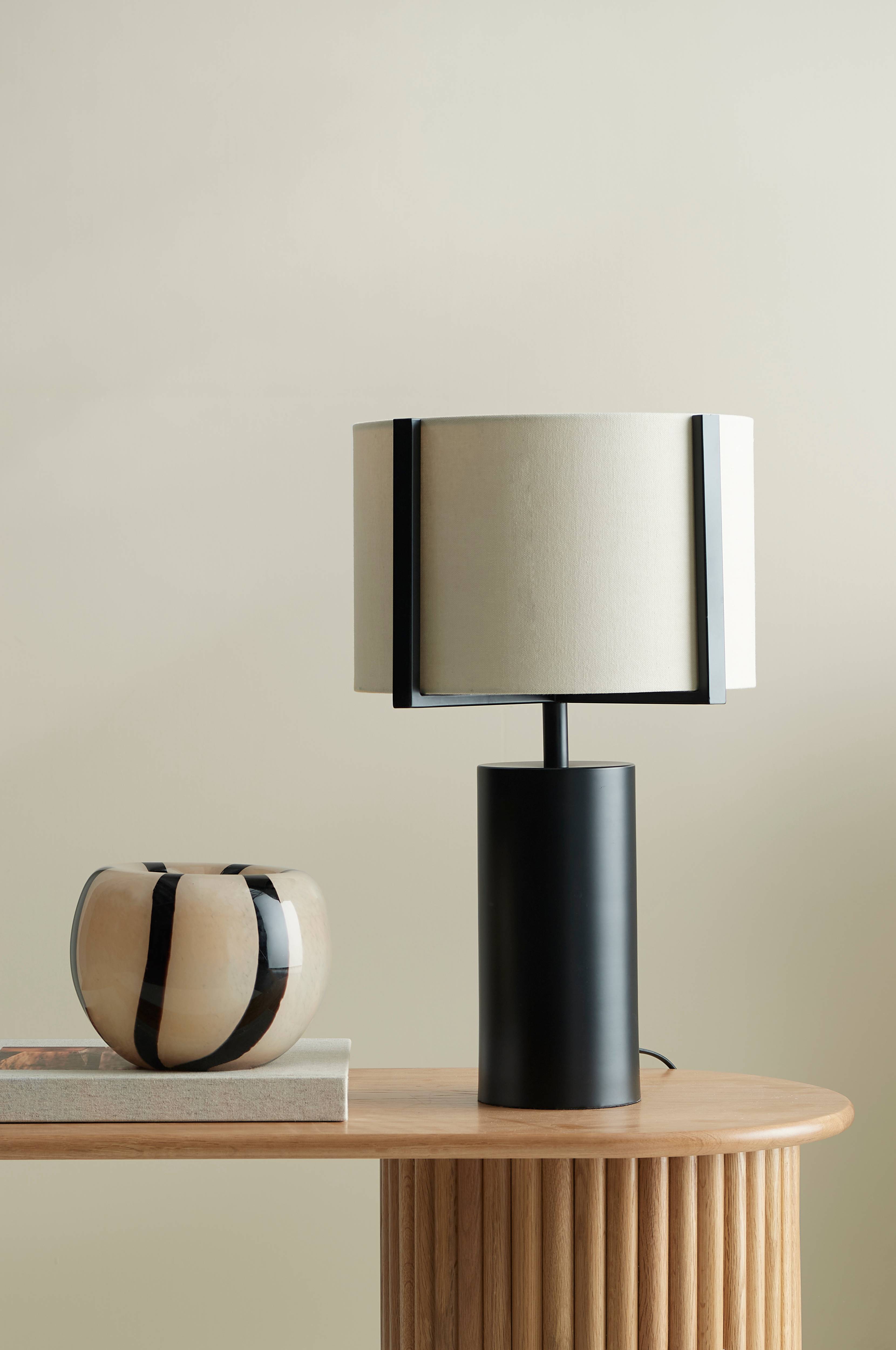 Bordlampe med fod og skærmholdere af metal med mat finish. Skærm af stof med grovere struktur. Total højde 50 cm. Skærmens mål: Ø 30 cm, højde 20 cm. Lampefodens mål: Ø 12 cm, højde 25 cm. Sort ledning med afbryder, ledningslængde 200 cm. Sokkel E27. Maks. 40 W. Pære medfølger ikke.