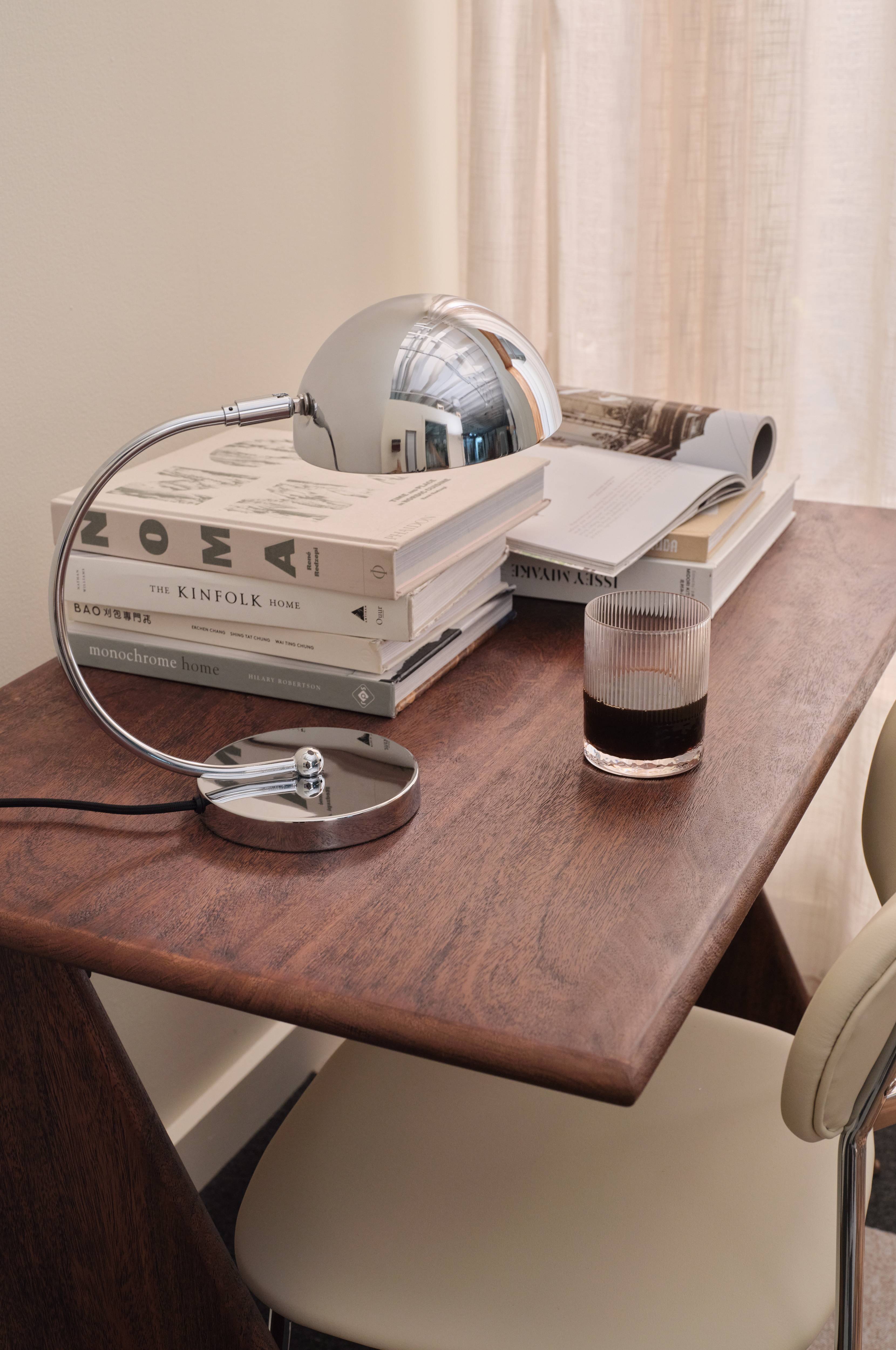 • Bordlampe i blankt, forkromet metal• Tekstilsnor med kontakt• Pære medfølger ikke